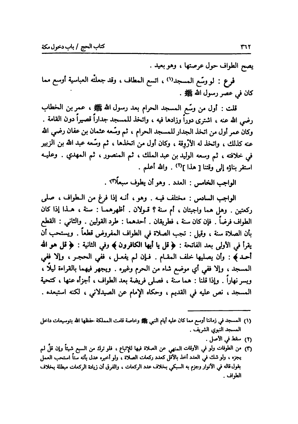 يصح الطواف حول عرصتها، وهو بعيد. فرع لو وسع المسجد، اتسع المطاف، وقد جعلته العباسية أوسع مما كان في عصر رسول الله - صلى الله عليه وسلم -. قلت: أول من وسع المسجد الحرام بعد رسول الله - صلى الله عليه وسلم -، عمر بن الخطاب رضي الله عنه، اشترى دورا وزادها فيه، واتخذ للمسجد جدارا قصيرا دون القامة. وكان عمر أول من اتخذ الجدار للمسجد الحرام، ثم وسعه عثمان بن عفإن رضي الله عنه كذلك، واتخذ له الاروقة، وكان أول من اتخذها، ثم وسعه عبد الله بن الزبير في خلافته، ثم وسعه الوليد بن عبد الملك، ثم المنصور، ثم المهدي. وعليه استقر بناؤه إلى وقتنا هذا. والله أعلم. الواجب الخامس: العدد. وهو أن يطوف سبعا. الواجب السادس: مختلف فيه. وهو، أنه إذا فرغ من الطواف، صلى ركعتين. وهل هما واجبتان، أم سنة ؟ قولان. أظهرهما: سنة، هذا إذا كان الطواف فرضا. فإن كان سنة، فطريقان. أحدهما: طرد القولين. والثاني: القطع بأن الصلاة سنة. وقيل: تجب الصلاة في الطواف المفروض قطعا. ويستحب أن يقرأ في الاولى بعد الفاتحة: * (قل يا أيها الكافرون) * وفي الثانية: * (قل هو الله أحد) *: وأن يصليها خلف المقام. فإن لم يفعل، ففي الحجر، وإلا ففي المسجد، وإلا ففي أي موضع شاء من الحرم وغيره. ويجهر فيهما بالقراءة ليلا، ويسر نهارا. وإذا قلنا: هما سنة، فصلى فريضة بعد الطواف، أجزأه عنها، كتحية المسجد، نص عليه في القديم، وحكاه الامام عن الصيدلاني، لكنه استبعده.