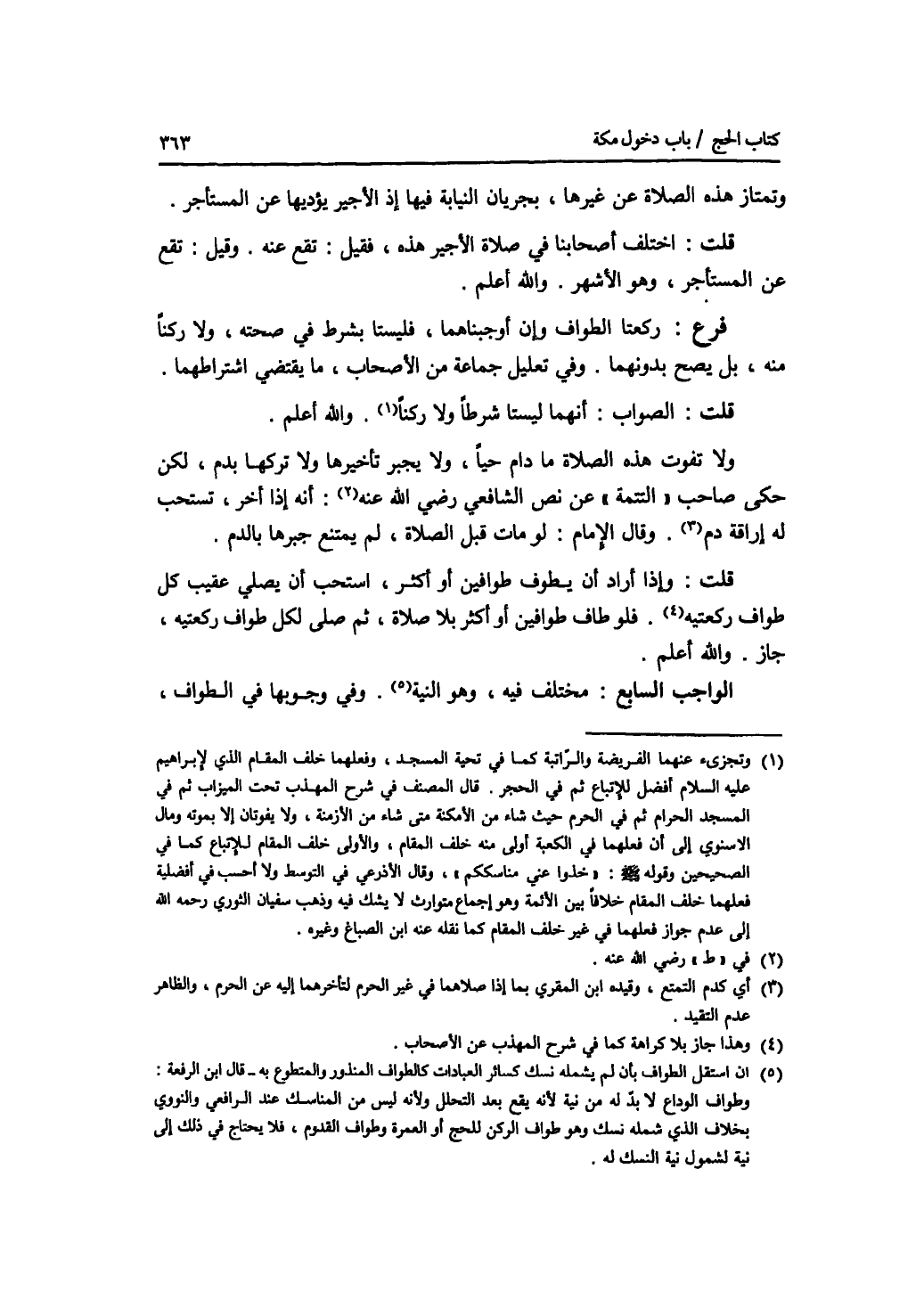 وتمتاز هذه الصلاة عن غيرها، بجريان النيابة فيها إذ الاجير يؤديها عن المستأجر. قلت: اختلف أصحابنا في صلاة الاجير هذه، فقيل: تقع عنه. وقيل: تقع عن المستأجر، وهو الاشهر. والله أعلم. فرع ركعتا الطواف وإن أوجبناهما، فليستا بشرط في صحته، ولا ركنا منه، بل يصح بدونهما. وفي تعليل جماعة من الاصحاب، ما يقتضي اشتراطهما. قلت: الصواب: أنهما ليستا شرطا ولا ركنا. والله أعلم. ولا تفوت هذه الصلاة ما دام حيا، ولا يجبر تأخيرها، ولا تركها بدم، لكن حكى صاحب التتمة عن نص الشافعي رضي الله عنه: أنه إذا أخر، تستحب له إراقة دم. وقال الامام: لو مات قبل الصلاة، لم يمتنع جبرها بالدم. قلت: وإذا أراد أن يطوف طوافين أو أكثر، استحب أن يصلي عقيب كل طواف ركعتيه. فلو طاف طوافين أو أكثر بلا صلاة، ثم صلى لكل طواف ركعتيه، جاز. والله أعلم. الواجب السابع: مختلف فيه، وهو النية. وفي وجوبها في الطواف،