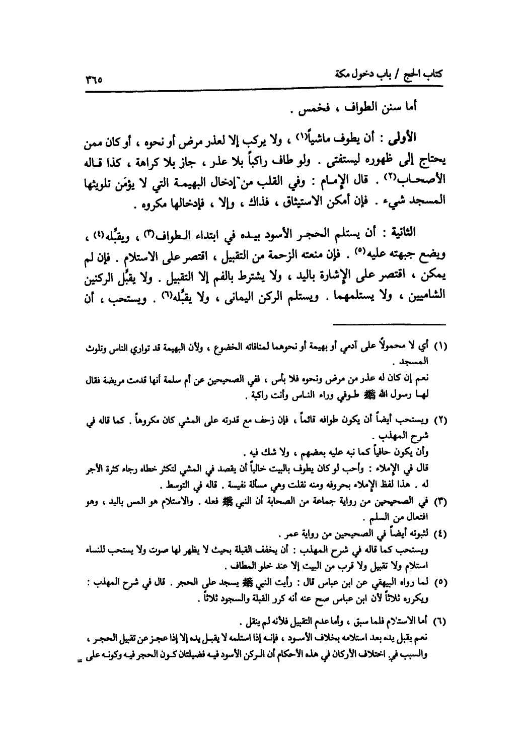 أما سنن الطواف، فخمس. الاولى: أن يطوف ماشيا، ولا يركب إلا لعذر مرض أو نحوه، أو كان ممن يحتاج إلى ظهوره ليستفتي. ولو طاف راكبا بلا عذر، جاز بلا كراهة، كذا قاله الاصحاب. قال الامام: وفي القلب من إدخال البهيمة التي لا يؤمن تلويثها المسجد شئ. فإن أمكن الاستيثاق، فذاك، وإلا، فإدخالها مكروه. الثانية: أن يستلم الحجر الاسود بيده في ابتداء الطواف، ويقبله، ويضع جبهته عليه. فإن منعته الزحمة من التقبيل، اقتصر على الاستلام. فإن لم يمكن، اقتصر على الاشارة باليد، ولا يشترط بالفم إلا التقبيل. ولا يقبل الركنين الشاميين، ولا يستلمهما. ويستلم الركن اليماني، ولا يقبله. ويستحب، أن