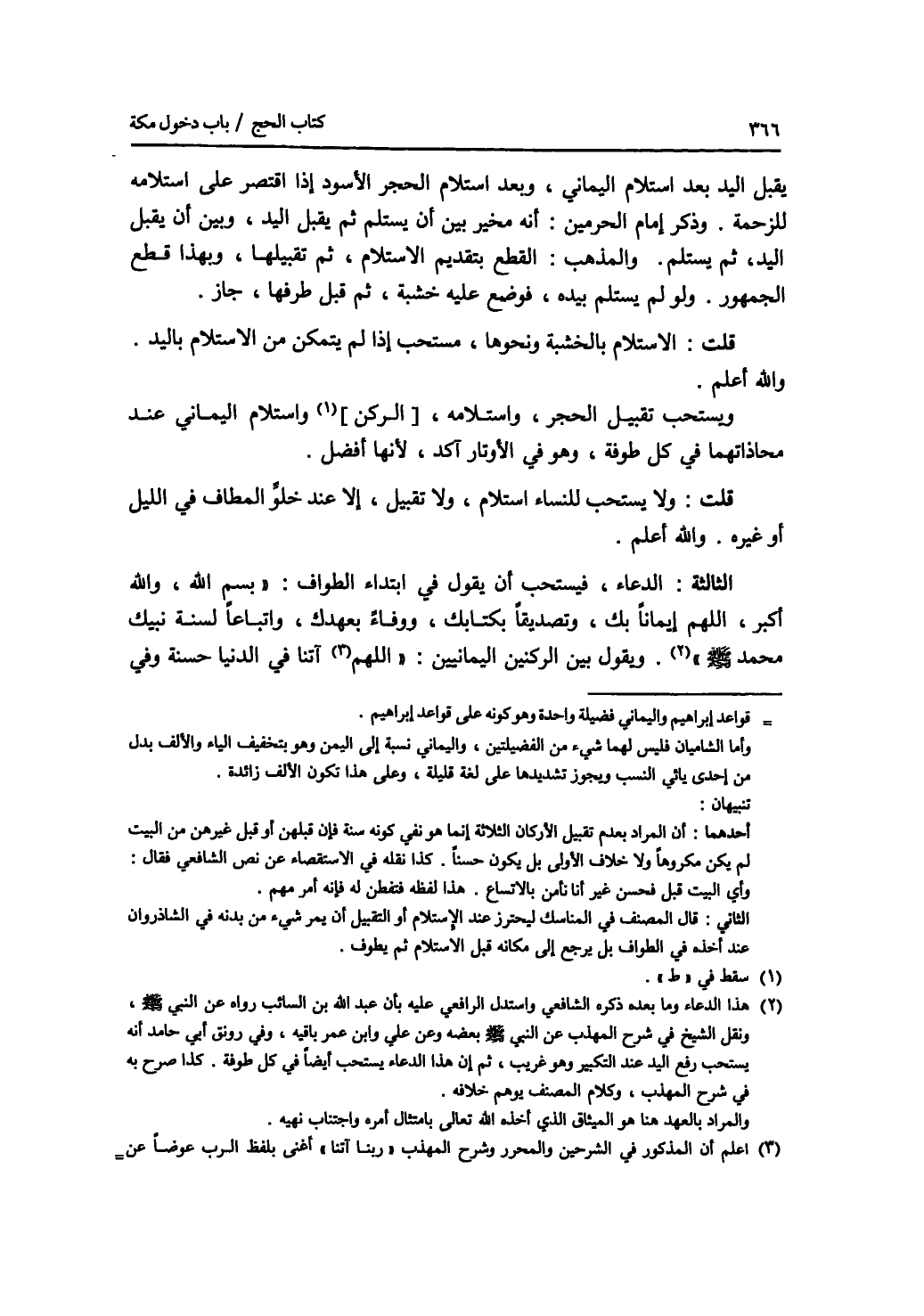 يقبل اليد بعد استلام اليماني، وبعد استلام الحجر الاسود إذا اقتصر على استلامه للزحمة. وذكر إمام الحرمين: أنه مخير بين أن يستلم ثم يقبل اليد، وبين أن يقبل اليد، ثم يستلم. والمذهب: القطع بتقديم الاستلام، ثم تقبيلها، وبهذا قطع الجمهور. ولو لم يستلم بيده، فوضع عليه خشبة، ثم قبل طرفها، جاز. قلت: الاستلام بالخشبة ونحوها، مستحب إذا لم يتمكن من الاستلام باليد. والله أعلم. ويستحب تقبيل الحجر، واستلامه، واستلام اليماني عند محاذاتهما في كل طوفة، وهو في الاوتار آكد، لانها أفضل. قلت: ولا يستحب للنساء استلام، ولا تقبيل، إلا عند خلو المطاف في الليل أو غيره. والله أعلم. الثالثة: الدعاء، فيستحب أن يقول في ابتداء الطواف: بسم الله، والله أكبر، اللهم إيمانا بك، وتصديقا بكتابك، ووفاء بعهدك، واتباعا لسنة نبيك محمد - صلى الله عليه وسلم -. ويقول بين الركنين اليمانيين: اللهم آتنا في الدنيا حسنة وفي