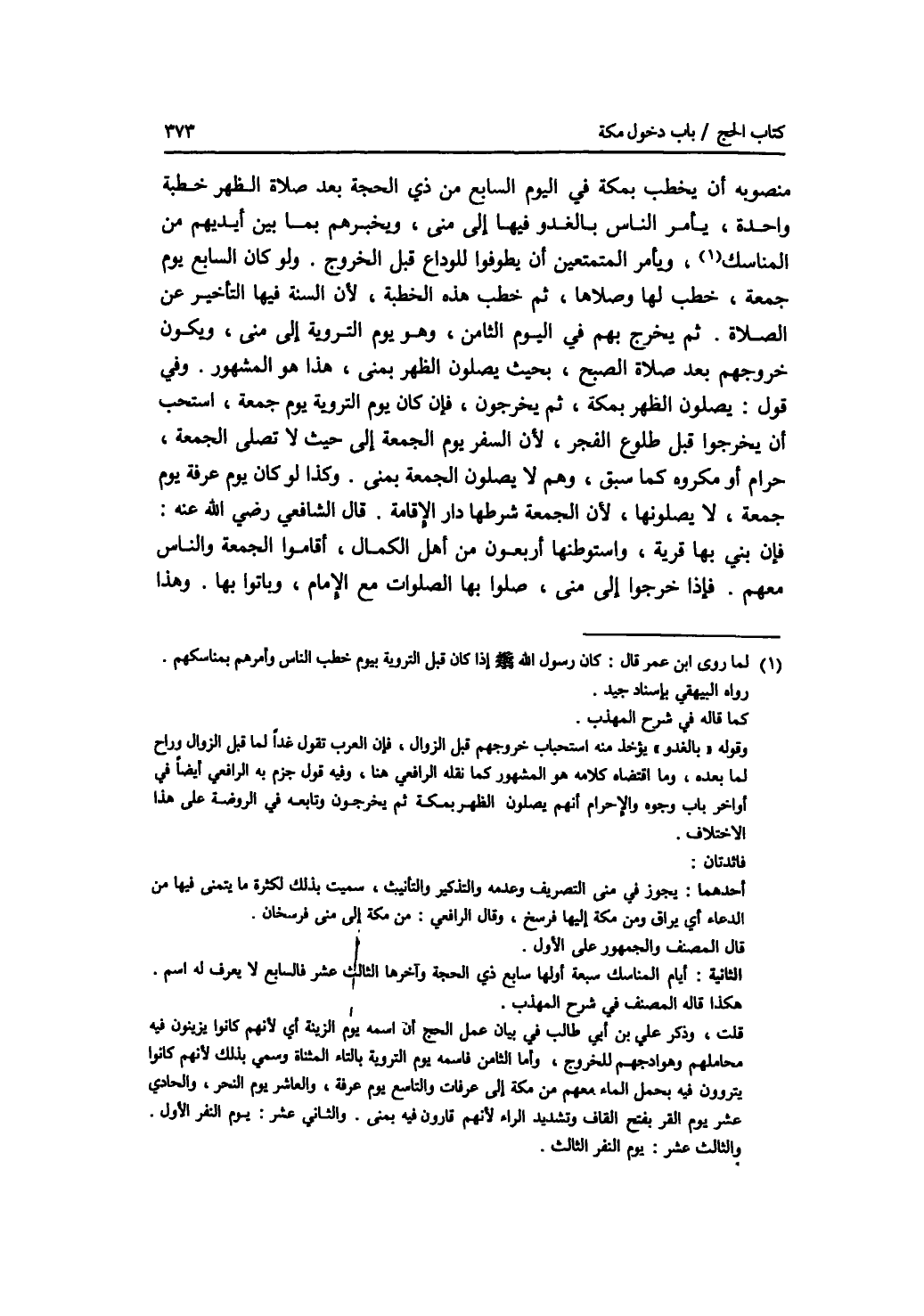 منصوبه أن يخطب بمكة في اليوم السابع من ذي الحجة بعد صلاة الظهر خطبة واحدة، يأمر الناس بالغدو فيها إلى منى، ويخبرهم بما بين أيديهم من المناسك، ويأمر المتمتعين أن يطوفوا للوداع قبل الخروج. ولو كان السابع يوم جمعة، خطب لها وصلاها، ثم خطب هذه الخطبة، لان السنة فيها التأخير عن الصلاة. ثم يخرج بهم في اليوم الثامن، وهو يوم التروية إلى منى، ويكون خروجهم بعد صلاة الصبح، بحيث يصلون الظهر بمنى، هذا هو المشهور. وفي قول: يصلون الظهر بمكة، ثم يخرجون، فإن كان يوم التروية يوم جمعة، استحب أن يخرجوا قبل طلوع الفجر، لان السفر يوم الجمعة إلى حيث لا تصلى الجمعة، حرام أو مكروه كما سبق، وهم لا يصلون الجمعة بمنى. وكذا لو كان يوم عرفة يوم جمعة، لا يصلونها، لان الجمعة شرطها دار الاقامة. قال الشافعي رضي الله عنه: فإن بني بها قرية، واستوطنها أربعون من أهل الكمال، أقاموا الجمعة والناس معهم. فإذا خرجوا إلى منى، صلوا بها الصلوات مع الامام، وباتوا بها. وهذا