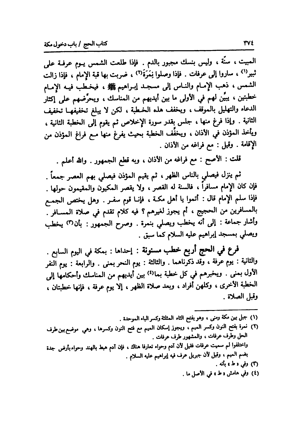 المبيت، سنة، وليس بنسك مجبور بالدم. فإذا طلعت الشمس يوم عرفة على ثبير، ساروا إلى عرفات. فإذا وصلوا نمرة، ضربت بها قبة الامام، فإذا زالت الشمس، ذهب الامام والناس إلى مسجد إبراهيم - صلى الله عليه وسلم - فيخطب فيه الامام خطبتين، يبين لهم في الاولى ما بين أيديهم من المناسك، ويحرهم على إكثار الدعاء والتهليل بالموقف، ويخفف هذه الخطبة، لكن لا يبلغ تخفيفها تخفيف الثانية. وإذا فرغ منها، جلس بقدر سورة (الاخلاص) ثم يقوم إلى الخطبة الثانية، ويأخذ المؤذن في الاذان، ويخفف الخطبة يحيث يفرغ منها مع فراغ المؤذن من الاقامة. وقيل: مع فراغه من الاذان. قلت: الاصح: مع فراغه من الاذان، وبه قطع الجمهور. والله أعلم. ثم ينزل فيصلي بالناس الظهر، ثم يقيم المؤذن فيصلي بهم العصر جمعا. فإن كان الامام مسافرا، فالسنة له القصر، ولا يقصر المكيون والمقيمون حولها. فإذا سلم الامام قال: أتموا يا أهل مكة، فإنا قوم سفر. وهل يختص الجمع بالمسافرين من الحجيج، أم يجوز لغيرهم ؟ فيه كلام تقدم في صلاة المسافر. وأشار جماعة: إلى أنه يخطب ويصلي بنمرة. وصرح الجمهور: بأنه يخطب ويصلي بمسجد إبراهيم - صلى الله عليه وسلم - كما سبق. فرع في الحج أربع خطب مسنونة إحداها: بمكة في اليوم السابع. والثانية: يوم عرفة، وقد ذكرناهما. والثالثة: يوم النحر بمنى. والرابعة: يوم النفر الاول بمنى. ويخبرهم في كل خطبة بما بين أيديهم من المناسك وأحكامها إلى الخطبة الاخرى، وكلهن أفراد، وبعد صلاة الظهر، إلا يوم عرفة، فإنها خطبتان، وقبل الصلاة.