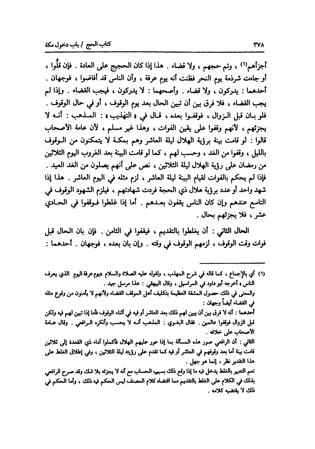 أجزأهم، وتم حجهم، ولا قضاء. هذا إذا كان الحجيج على العادة. فإن قلوا، أو جاءت شرذمة يوم النحر فظنت أنه يوم عرفة، وأن الناس قد أفاضوا، فوجهان. أحدهما، يدركون، ولا قضاء. وأصحهما: لا يدركون، فيجب القضاء. وإذا لم يجب القضاء، فلا فرق بين أن تبين الحال بعد يوم الوقوف، أو في حال الوقوف. فلو بان قبل الزوال، فوقفوا بعده، قال في التهذيب: المذهب: أنه لا يجزئهم، لانهم وقفوا على يقين الفوات، وهذا غير مسلم، لان عامة الاصحاب قالوا: لو قامت بينة برؤية الهلال ليلة العاشر وهم بمكة لا يتمكنون من الوقوف بالليل، وقفوا من الغد، وحسب لهم، كما لو قامت البينة بعد الغروب اليوم الثلاثين من رمضان على رؤية الهلال ليلة الثلاثين، نص على أنهم يصلون من الغد العيد. فإذا لم يحكم بالفوات لقيام البينة ليلة العاشر، لزم مثله في اليوم العاشر. هذا إذا شهد واحد أو عدد برؤية هلال ذي الحجة فردت شهادتهم، فيلزم الشهود الوقوف في التاسع عندهم وإن كان الناس يقفون بعدهم. أما إذا غلطوا فوقفوا في الحادي عشر، فلا يجزئهم بحال. الحال الثاني: أن يغلطوا بالتقديم، فيقفوا في الثمن. فإن بان الحال قبل فوات وقت الوقوف، لزمهم الوقوف في وقته. وإن بان بعده، فوجهان. أحدهما: