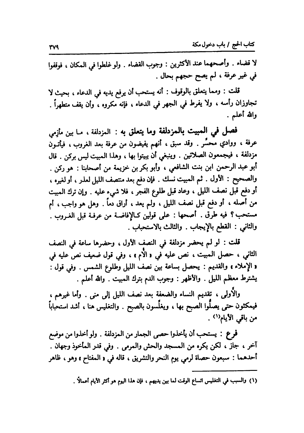 لا قضاء. وأصحهما عند الاكثرين: وجوب القضاء. ولو غلطوا في المكان، فوقفوا في غير عرفة، لم يصح حجهم بحال. قلت: ومما يتعلق بالوقوف: أنه يستحب أن يرفع يديه في الدعاء، بحيث لا تجاوزان رأسه، ولا يفرط في الجهر في الدعاء، فإنه مكروه، وأن يقف متطهرا. والله أعلم. فصل في المبيت بالمزدلفة وما يتعلق به المزدلفة، ما بين مأزمي عرفة، ووادي محسر. وقد سبق، أنهم يفيضون من عرفة بعد الغروب، فيأتون مزدلفة، فيجمعون الصلاتين. وينبغي أن يبيتوا بها، وهذا المبيت ليس بركن. قال أبو عبد الرحمن ابن بنت الشافعي، وأبو بكر بن خزيمة من أصحابنا: هو ركن. والصحيح: الاول. ثم المبيت نسك. فإن دفع بعد منتصف الليل لعذر، أو لغيره، أو دفع قبل نصف الليل، وعاد قبل طلوع الفجر، فلا شئ عليه. وإن ترك المبيت من أصله، أو دفع قبل نصف الليل، ولم يعد، أراق دما. وهل هو واجب، أم مستحب ؟ فيه طرق. أصحها: على قولين كالافاضة من عرفة قبل الغروب. والثاني: القطع بالايجاب. والثالث: بالاستحباب. قلت: لو لم يحضر مزدلفة في النصف الاول، وحضرها ساعة في النصف الثاني، حصل المبيت، نص عليه في الام، وفي قول ضعيف نص عليه في الاملاء والقديم: يحصل بساعة بين نصف الليل وطلوع الشمس. وفي قول: يشترط معظم الليل. والاظهر: وجوب الدم بترك المبيت. والله أعلم. والاولى، تقديم النساء والضعفة بعد نصف الليل إلى منى. وأما غيرهم، فيمكثون حتى يصلوا الصبح بها، ويغلسون بالصبح. والتغليس هنا، أشد استحبابا من باقي الايام. فرع يستحب أن يأخذوا حصى الجمار من المزدلفة. ولو أخذوا من موضع آخر، جاز، لكن يكره من المسجد والحش والمرمى. وقد قدر المأخوذ وجهان. أحدهما: سبعون حصاة لرمي يوم النحر والتشريق، قاله في المفتاح وهو، ظاهر