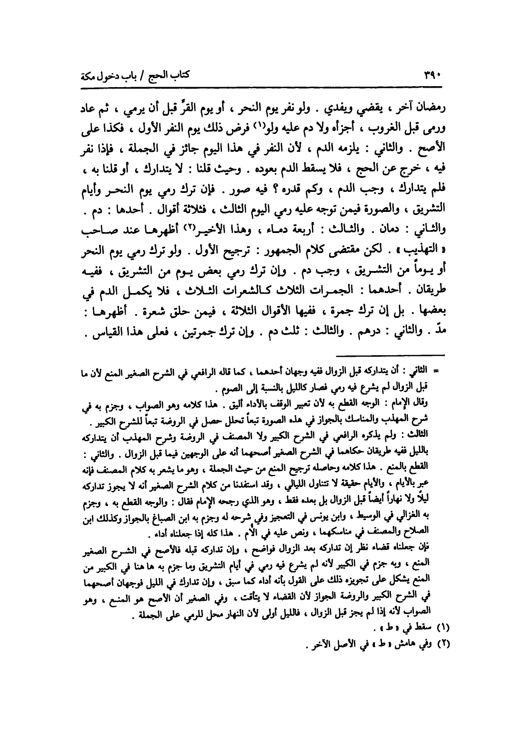 رمضان آخر، يقضي ويفدي. ولو نفر يوم النحر، أو يوم القر قبل أن يرمي، ثم عاد ورمى قبل الغروب، أجزأه ولا دم. ولو فرض ذلك يوم النفر الاول، فكذا على الاصح. والثاني: يلزمه الدم، لان النفر في هذا اليوم جائز في الجملة، فإذا نفر فيه، خرج عن الحج، فلا يسقط الدم بعوده. وحيث قلنا: لا يتدارك، أو قلنا به، فلم يتدارك، وجب الدم، وكم قدره ؟ فيه صور. فإن ترك رمي يوم النحر وأيام التشريق، والصورة فيمن توجه عليه رمي اليوم الثالث، فثلاثة أقوال أحدها: دم. والثاني: دمان. والثالث: أربعة دماء، وهذا الاخير أظهرها عند صاحب التهذيب. لكن مقتضى كلام الجمهور: ترجيح الاول. ولو ترك رمي يوم النحر أو يوما من التشريق، وجب دم. وإن ترك رمي بعض يوم من التشريق، ففيه طريقان. أحدهما: الجمرات الثلاث كالشعرات الثلاث، فلا يكمل الدم في بعضها. بل إن ترك جمرة، ففيها الاقوال الثلاثة، فيمن حلق شعرة. أظهرها: مد. والثاني: درهم. والثالث: ثلث دم. وإن ترك جمرتين، فعلى هذا القياس.