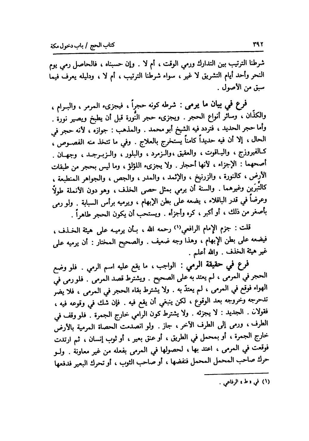 شرطنا الترتيب بين التدارك ورمي الوقت، أم لا. وإن حسبناه، فالحاصل رمي يوم النحر وأحد أيام التشريق لا غير، سواء شرطنا الترتيب، أم لا، ودليله يعرف مما سبق من الاصول. فرع في بيان ما يرمى شرطه كونه حجرا، فيجزئ المرمر، والبيرام، والكذان، وسائر أنواع الحجر. ويجزئ حجر النورة قبل أن يطبح ويصير نورة. وأما حجر الحديد، فتردد فيه الشيخ أبو محمد. والمذهب: جوازه، لانه حجر في الحال، إلا أن فيه حديدا كامنا يستخرج بالعلاج وفي ما تتخذ منه الفصوص، كالفيروزج، والياقوت، والعقيق، والزمرد، والبلور، والزبرجد، وجهان. أصحهما: الاجزاء، لانها أحجار. ولا يجزئ اللؤلؤ، وما ليس بحجر من طبقات الارض، كالنورة، والزرنيخ، والاثمد، والمدر، والجص، والجواهر المنطبعة، كالتبرين وغيرهما. والسنة أن يرمي بمثل حصى الخذف، وهو دون الانملة طولا وعرضا في قدر الباقلاء، يضعه على بطن الابهام، ويرميه برأس السبابة. ولو رمى بأصغر من ذلك، أو أكبر، كره وأجزأه. ويستحب أن يكون الحجر طاهرا. قلت: جزم الامام الرفاعي رحمه الله، بأن يرميه على هيأة الخذف، فيضعه على بطن الابهام، وهذا وجه ضعيف. والصحيح المختار: أن يرميه على غير هيأة الخذف. والله أعلم. فرع في حقيقة الرمي الواجب، ما يقع عليه اسم الرمي. فلو وضع الحجر في المرمى، لم يعتد به على الصحيح. ويشترط قصد المرمى. فلو رمى في الهواء فوقع في المرمى، لم يعتد به. ولا يشترط بقاء الحجر في المرمى، فلا يضر تدحرجه وخروجه بعد الوقوع، لكن ينبغي أن يقع فيه. فإن شك في وقوعه فيه، فقولان. الجديد: لا يجزئه. ولا يشترط كون الرامي خارج الجمرة. فلو وقف في الطرف، ورمى إلى الطرف الآخر، جاز. ولو انصدمت الحصاة المرمية بالارض خارج الجمرة، أو بمحمل في الطريق، أو عنق بعير، أو ثوب إنسان، ثم ارتدت فوقعت في المرمى، اعتد بها، لحصولها في المرمى بفعله من غير معاونة. ولو حرك صاحب المحمل المحمل فنفضها، أو صاحب الثوب، أو تحرك البعير فدفعها