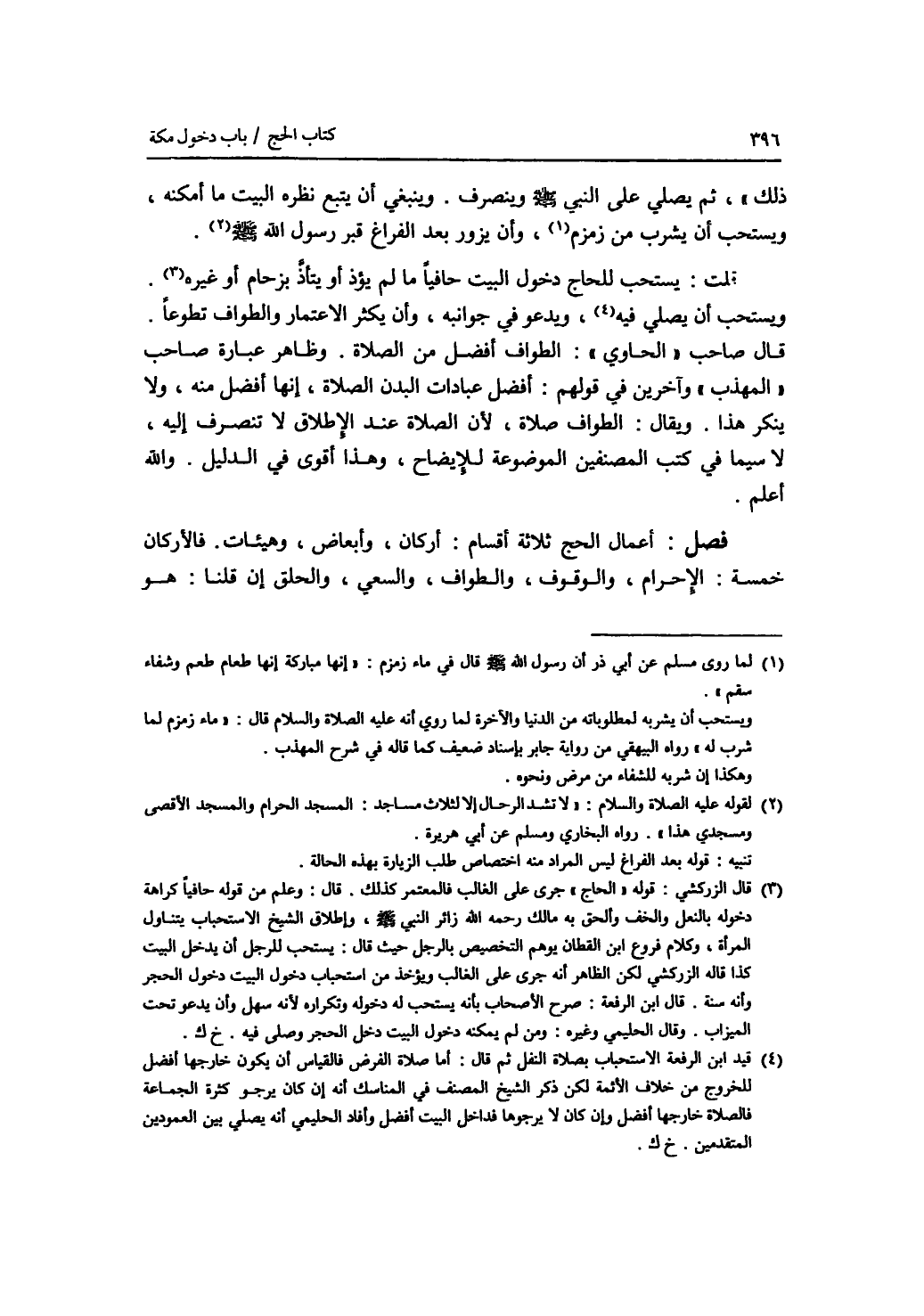 ذلك، ثم يصلي على النبي - صلى الله عليه وسلم - وينصرف. وينبغي أن يتبع نظره البيت ما أمكنه، ويستحب أن يشرب من زمزم، وأن يزور بعد الفراغ قبر رسول الله - صلى الله عليه وسلم -. قلت: يستحب للحاج دخول البيت حافيا ما لم يؤذ أو يتأذ بزحام أو غيره. ويستحب أن يصلي فيه، ويدعو في جوانبه، وأن يكثر الاعتمار والطواف تطوعا قال صاحب الحاوي: الطواف أفضل من الصلاة. وظاهر عبارة صاحب المهذب وآخرين في قولهم: أفضل عبادات البدن الصلاة، أنها أفضل منه، ولا ينكر هذا. ويقال: الطواف صلاة، لان الصلاة عند الاطلاق لا تنصرف إليه، لا سيما في كتب المصنفين الموضوعة للايضاح، وهذا أقوى في الدليل. والله أعلم. فصل أعمال الحج ثلاثة أقسام: أركان، وأبعاض، وهيآت. فالاركان خمسة: الاحرام، والوقوف، والطواف، والسعي، والحلق إن قلنا: هو