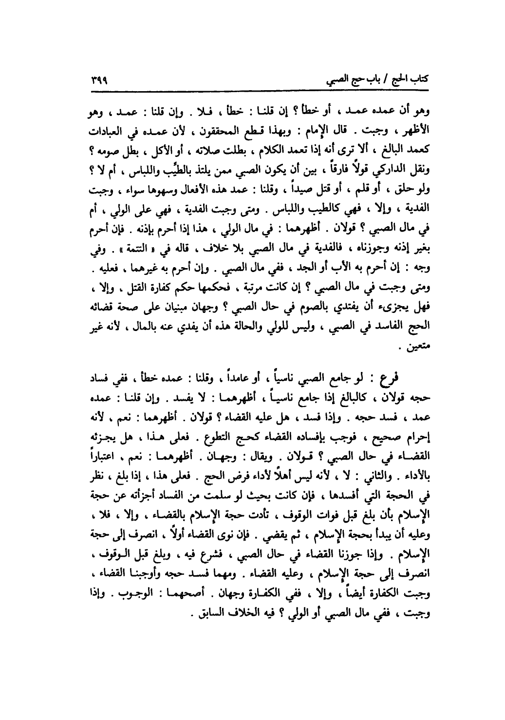 وهو أن عمده عمد، أو خطأ ؟ إن قلنا: خطأ، فلا. وإن قلنا: عمد، وهو الاظهر، وجبت. قال الامام: وبهذا قطع المحققون، لان عمده في العبادات كعمد البالغ، ألا ترى أنه إذا تعمد الكلام، بطلت صلاته، أو الاكل، بطل صومه ؟ ونقل الداركي قولا فارقا، بين أن يكون الصبي ممن يلتذ بالطيب واللباس، أم لا ؟ ولو حلق، أو قلم، أو قتل صيدا، وقلنا: عمد هذه الافعال وسهوها سواء، وجبت الفدية، وإلا، فهي كالطيب واللباس. ومتى وجبت الفدية، فهي على الولي، أم في مال الصبي ؟ قولان. أظهرهما: في مال الولي، هذا إذا أحرم بإذنه. فإن أحرم بغير إذنه وجوزناه، فالفدية في مال الصبي بلا خلاف، قاله في التتمة. وفي وجه: إن أحرم به الاب أو الجد، ففي مال الصبي. وإن أحرم به غيرهما، فعليه. ومتى وجبت في مال الصبي ؟ إن كانت. مرتبة، فحكمها حكم كفارة القتل، وإلا، فهل يجزئ أن يفتدي بالصوم في حال الصبي ؟ وجهان مبنيان على صحة قضائه الحج الفاسد في الصبي، وليس للولي والحالة هذه أن يفدي عنه بالمال، لانه غير متعين. فرع لو جامع الصبي ناسيا، أو عامدا، وقلنا: عمده خطأ، ففي فساد حجه قولان، كالبالغ إذا جامع ناسيا، أظهرهما: لا يفسد. وإن قلنا: عمده عمد، فسد حجه. وإذا فسد، هل عليه القضاء ؟ قولان. أظهرهما: نعم لانه إحرام صحيح، فوجب فإفساده القضاء كحج التطوع. فعلى هذا، هل يجزئه القضاء في حال الصبي ؟ قولان. ويقال: وجهان. أظهرهما: نعم، اعتبارا بالاداء. والثاني: لا، لانه ليس أهلا لاداء فرض الحج. فعلى هذا، إذا بلغ، نظر في الحجة التي أفسدها، فإن كانت بحيث لو سلمت من الفساد أجزأته عن حجة الاسلام بأن بلغ قبل فوات الوقوف، تأدت حجة الاسلام بالقضاء، وإلا، فلا، وعليه أن يبدأ بحجة الاسلام، ثم يقضي. فإن نوى القضاء أولا، انصرف إلى حجة الاسلام. وإذا جوزنا القضاء في حال الصبي، فشرع فيه، وبلغ قبل الوقوف، انصرف إلى حجة الاسلام، وعليه القضاء. ومهما فسد حجه وأوجبنا القضاء، وجبت الكفارة أيضا، وإلا، ففي الكفارة وجهان. أصحهما: الوجوب. وإذا وجبت، ففي مال الصبي أو الولي ؟ فيه الخلاف السابق.