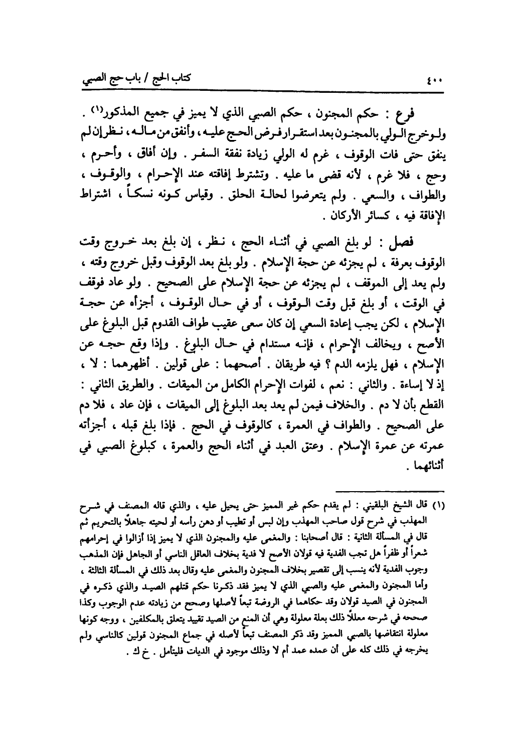 فرع حكم المجنون، حكم الصبي الذي لا يميز في جميع المذكور. ولو خرج الولي بالمجنون بعد استقرار فرض الحج عليه، وأنفق من ماله، نظر، إن لم ينفق حتى فات الوقوف، غرم له الولي زيادة نفقة السفر. وإن أفاق، وأحرم، وحج، فلا غرم، لانه قضى ما عليه. وتشترط إفاقته عند الاحرام، والوقوف، والطواف، والسعي. ولم يتعرضوا لحالة الحلق. وقياس كونه نسكا، اشترط الافاقة فيه، كسائر الاركان. فصل لو بلغ الصبي في أثناء الحج، نظر، إن بلغ بعد خروج وقت الوقوف بعرفة، لم يجزئه عن حجة الاسلام. ولو بلغ بعد الوقوف وقبل خروج وقته، ولم يعد إلى الموقف، لم يجزئه عن حجة الاسلام على الصحيح. ولو عاد فوقف في الوقت، أو بلغ قبل وقت الوقوف، أو في حال الوقوف، أجزأه عن حجة الاسلام، لكن يجب إعادة السعي إن كان سعى عقيب طواف القدوم قبل البلوغ على الاصح، ويخالف الاحرام، فإنه مستدام في حال البلوغ. وإذا وقع حجه عن الاسلام، فهل يلزمه الدم ؟ فيه طريقان. أصحهما: على قولين. أظهرهما: لا إذ لا إساءة. والثاني: نعم، لفوات الاحرام الكامل من الميقات. والطريق الثاني: القطع بأن لا دم. والخلاف فيمن لم يعد بعد البلوغ إلى الميقات، فإن عاد، فلا دم على الصحيح والطواف في العمرة، كالوقوف في الحج. فإذا بلغ قبله، أجزأته عمرته عن عمرة الاسلام. وعتق العبد في أثناء الحج والعمرة، كبلوغ الصبي في أثنائهما.