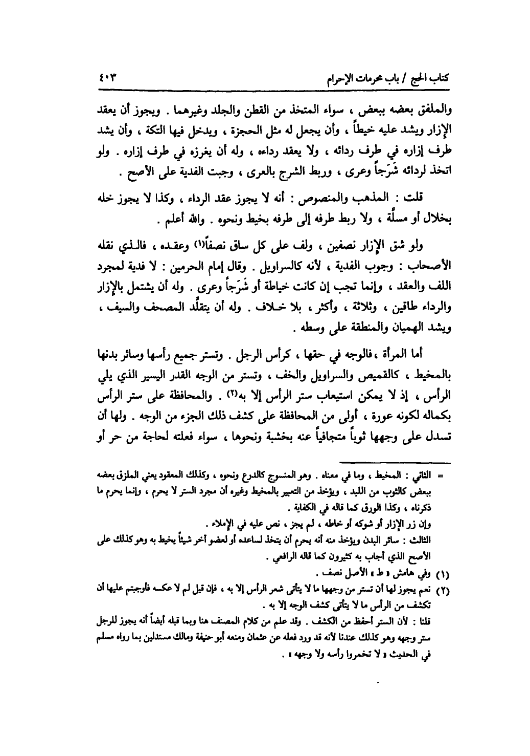 والملفق بعضه ببعض، سواء المتخذ من القطن والجلد وغيرهما. ويجوز أن يعقد الازار ويشد عليه خيطا، وأن يجعل له مثل الحجزة، ويدخل فيها التكة، وأن يشد طرف إزاره في طرف ردائه، ولا يعقد رداءه، وله أن يغرزه في طرف إزاره. ولو اتخذ لردائه شرجا وعرى، وربط الشرج بالعرى، وجبت الفدية على الاصح. قلت: المذهب والمنصوص: أنه لا يجوز عقد الرداء، وكذا لا يجوز خله بخلال أو مسلة، ولا ربط طرفه إلى طرفه بخيط ونحوه. والله أعلم. ولو شق الازار نصفين، ولف على كل ساق نصفا وعقده، فالذي نقله الاصحاب: وجوب الفدية، لانه كالسراويل. وقال إمام الحرمين: لا فدية لمجرد اللف والعقد، وإنما تجب إن كانت خياطة أو شرجا وعرى. وله أن يشتمل بالازار والرداء طاقين، وثلاثة، وأكثر، بلا خلاف. وله أن يتقلد المصحف والسيف، ويشد الهميان والمنطقة على وسطه. أما المرأة، فالوجه في حقها، كرأس الرجل. وتستر جميع رأسها وسائر بدنها بالمخيط، كالقميص والسراويل والخف، وتستر من الوجه القدر اليسير الذي يلي الرأس، إذ لا يمكن استيعاب ستر الرأس إلا به. والمحافظة على ستر الرأس بكماله لكونه عورة، أولى من المحافظة على كشف ذلك الجزء من الوجه. ولها أن تسدل على وجهها ثوبا متجافيا عنه بخشبة ونحوها، سواء فعلته لحاجة من حر أو