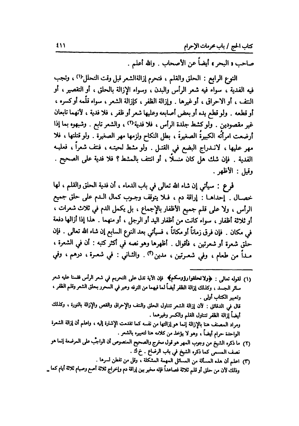 صاحب البحر أيضا عن الاصحاب. والله أعلم. النوع الرابع: الحلق والقلم، فتحرم إزالة الشعر قبل وقت التحلل، وتجب فيه الفدية، سواء فيه شعر الرأس والبدن، وسواء الازالة بالحلق، أو التقصير، أو النتف، أو الاحراق، أو غيرها. وإزالة الظفر، كإزالة الشعر، سواء قلمه أو كسره، أو قطعه. ولو قطع يده أو بعض أصابعه وعليها شعر أو ظفر، فلا فدية، لانهما تابعان غير مقصودين. ولو كشط جلدة الرأس، فلا فدية، والشعر تابع. وشبهوه بما إذا أرضعت امرأته الكبيرة الصغيرة، بطل النكاح ولزمها مهر الصغيرة. ولو قتلتها، فلا مهر عليها، لاندراج البضع في القتل. ولو مشط لحيته، فنتف شعرا، فعليه الفدية. فإن شك هل كان منسلا، أو انتتف بالمشط ؟ فلا فدية على الصحيح. وقيل: الاظهر. فرع سيأتي إن شاء الله تعالى في باب الدماء، أن فدية الحلق والقلم، لها خصال. إحداها: إراقة دم، فلا يتوقف وجوب كمال الدم على حلق جميع الرأس، ولا على قلم جميع الاظفار بالاجماع، بل يكمل الدم في ثلاث شعرات، أو ثلاثة أظفار، سواء كانت من أظفار اليد أو الرجل، أو منهما. هذا إذا أزالها دفعة في مكان. فإن فرق زمانا أو مكانا، فسيأتي بعد النوع السابع إن شاء الله تعالى. فإن حلق شعرة أو شعرتين، فأقوال. أظهرها وهو نصه في أكثر كتبه: أن في الشعرة، مدا من طعام، وفي شعرتين، مدين. والثاني: في شعرة، درهم، وفي