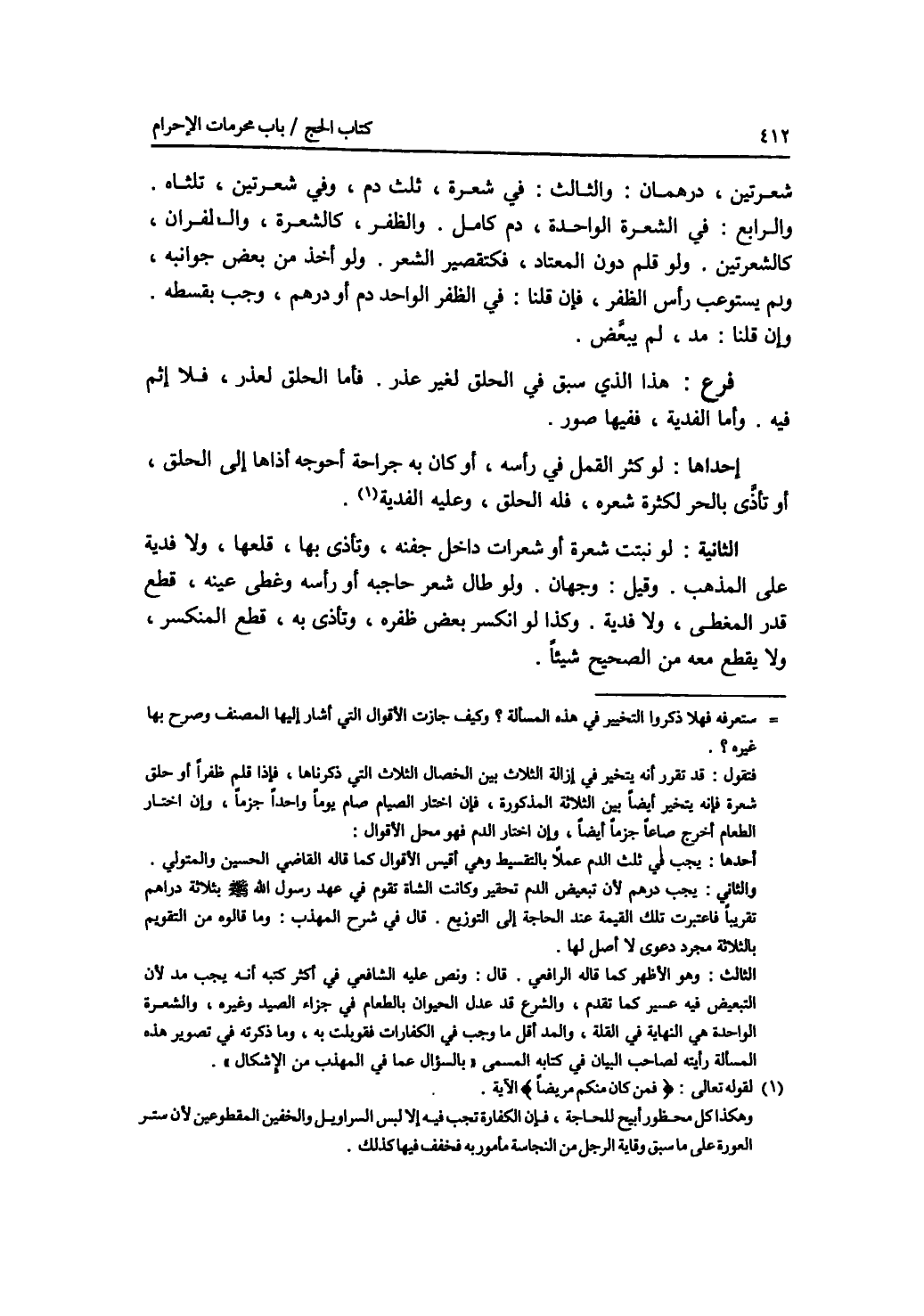 شعرتين، درهمان. والثالث: في شعرة، ثلث دم، وفي شعرتين، ثلثاه. والرابع: في الشعرة الواحدة، دم كامل. والظفر، كالشعرة، والظفران، كالشعرتين. ولو قلم دون المعتاد، فكتقصير الشعر. ولو أخذ من بعض جوانبه، ولم يستوعب رأس الظفر، فإن قلنا: في الظفر الواحد دم أو درهم، وجب بقسطه. وإن قلنا: مد، لم يبعض. فرع هذا الذي سبق في الحلق لغير عذر. فأما الحلق لعذر، فلا إثم فيه. وأما الفدية، ففيها صور. إحداها: لو كثر القمل في رأسه، أو كان به جراحة أحوجه أذاها إلى الحلق، أو تأذى بالحر لكثرة شعره، فله الحلق، وعليه الفدية. الثانية: لو نبتت شعرة أو شعرات داخل جفنه، وتأذى بها، قلعها، ولا فدية على المذهب. وقيل: وجهان. ولو طال شعر حاجبه أو رأسه , وغطى عينه، قطع قدر المغطى، ولا فدية. وكذا لو انكسر بعض ظفره، وتأذى به، قطع المنكسر، ولا يقطع معه من الصحيح شيئا.