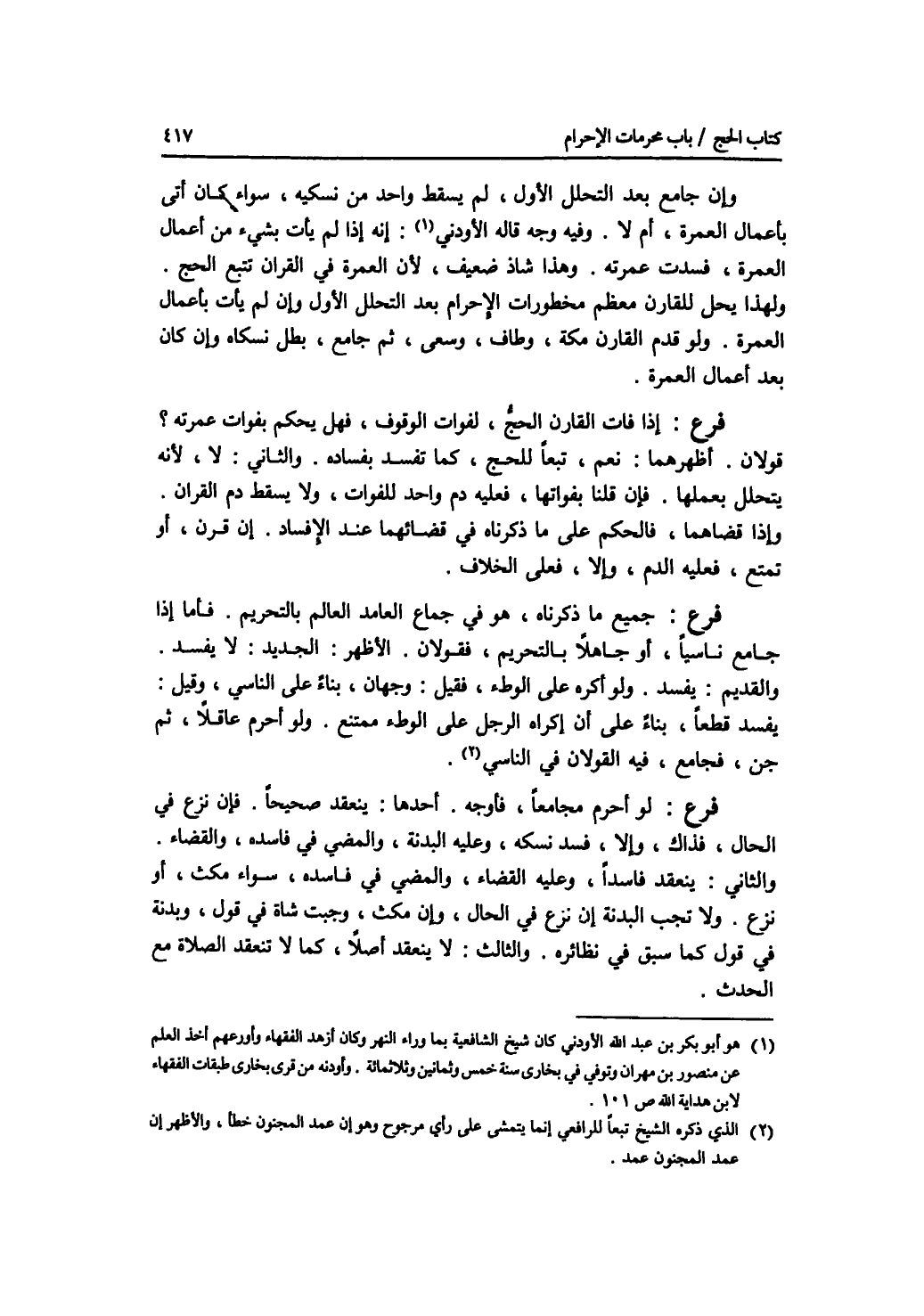 وإن جامع بعد التحلل الاول، لم يسقط واحد من نسكيه، سواء كان أتى بأعمال العمرة، أم لا. وفيه وجه قاله الاودني: أنه إذا لم يأت بشئ من أعمال العمرة، كسدت عمرته. وهذا شاذ ضعيف، لان العمرة في القران تتبع الحج. ولهذا يحل للقارن معظم مخطورات الاحرام بعد التحلل الاول وإن لم يأت بأعمال العمرة ولو قدم القارن مكة، وطاف، وسعى، ثم جامع، بطل نسكاه وإن كان بعد أعمال العمرة. فرع إذا فات القارن الحج، لفوات الوقوف، فهل يحكم بفوات عمرته ؟ قولان. أظهرهما: نعم، تبعا للحج، كما تفسد بفساده. والثاني: لا، لانه يتحلل بعملها. فإن قلنا بفواتها، فعليه دم واحد للفوات، ولا يسقط دم القران. وإذا قضاهما، فالحكم على ما ذكرناه في قضائهما عند الافساد. إن قرن، أو تمتع، فعليه الدم، وإلا، فعلى الخلاف. فرع جميع ما ذكرناه، هو في جماع العامد العالم بالتحريم. فأما إذا جامع ناسيا، أو جاهلا بالتحريم، فقولان. الاظهر: الجديد: لا يفسد. والقديم: يفسد. ولو أكره على الوطئ، فقيل: وجهان، بناء على الناسي، وقيل: يفسد قطعا، بناء على أن إكراه الرجل على الوطئ ممتنع. ولو أحرم عاقلا، ثم جن، فجامع، فيه القولان في الناسي. فرع لو أحرم مجامعا. فأوجه. أحدها: ينعقد صحيحا. فإن نزع في الحال، فذاك، وإلا، فسد نسكه، وعليه البدنة، والمضي في فاسده، والقضاء. والثاني: ينعقد فاسدا، وعليه القضاء والمضي في فاسده، سواء مكث، أو نزع. ولا تجب البدنة إن نزع في الحال وإن مكث، وجبت شاة في قول، وبدنة في قول كما سبق في نظائره. والجالث: لا ينعقد أصلا، كما لا تنعقد الصلاة مع الحدث.