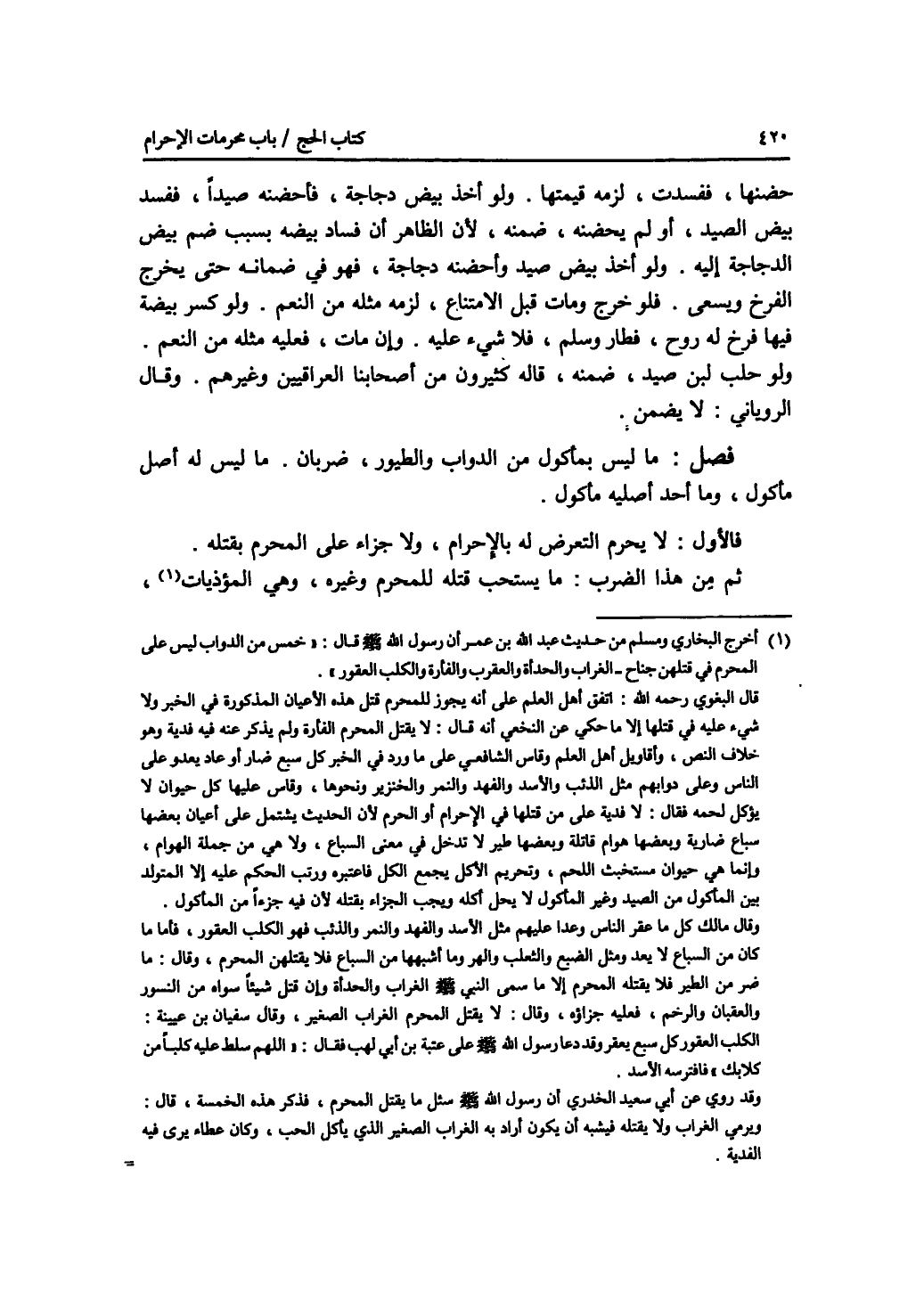 حضنها، ففسدت، لزمه قيمتها. ولو أخذ بيض دجاجة، فأحضنه صيدا، ففسد بيض الصيد، أو لم يحضنه، ضمنه، لان الظاهر أن فساد بيضه بسبب ضم بيض الدجاجة إليه. ولو أخذ بيض صيد وأحضنه دجاجة، فهو في ضمانة حتى يخرج الفرخ ويسعى. فلو خرج ومات قبل الامتناع، لزمه مثله من النعم. ولو كسر بيضة فيها فرخ له روح، فطار وسلم، فلا شئ عليه. وإن مات، فعليه مثله من النعم ولو حلب لبن صيد، ضمنه، قاله كثيرون من أصحابنا العراقيين وغيرهم. وقال الروياني: لا يضمن. فصل ما ليس بمأكول من الدواب والطيور، ضربان. ما ليس له أصل مأكول، وما أحد أصليه مأكول. فالاول: لا يحرم التعرض له بالاحرام، ولا جزاء على المحرم بقتله ثم من هذا الضرب: ما يستحب قتله للمحرم وغيره، وهي المؤذيات،