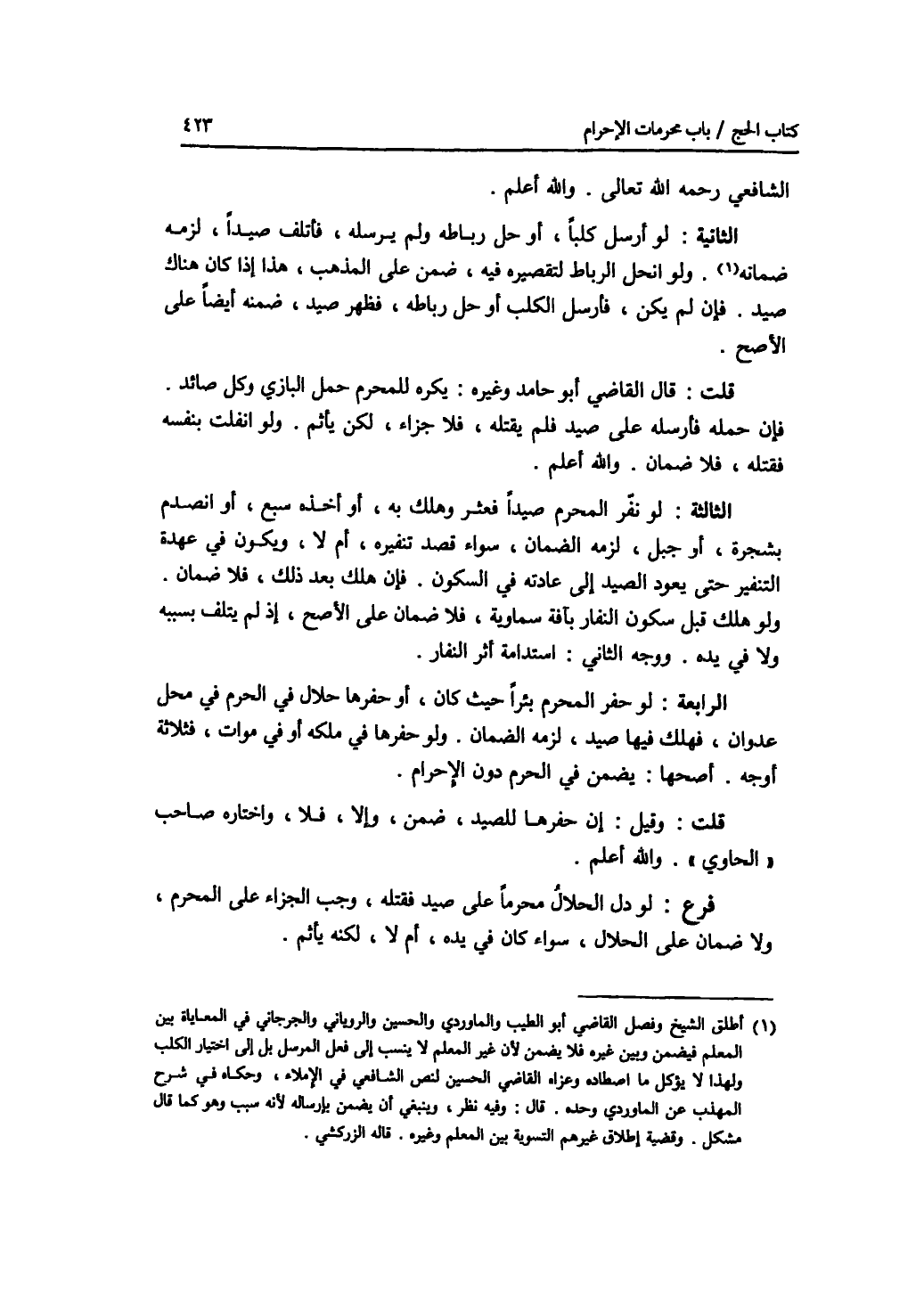 الشافعي رحمه الله تعالى. والله أعلم. الثانية: لو أرسل كلبا، أو حل رباطه ولم يرسله، فأتلف صيدا، لزمه ضمانه. ولو انحل الرباط لتقصيره فيه، ضمن على المذهب، هذا إذا كان هناك صيد. فإن لم يكن، فأرسل الكلب أو حل رباطه، فظهر صيد، ضمنه أيضا على الاصح. قلت: قال القاضي أبو حامد وغيره: يكره للمحرم حمل البازي وكل صائد. فإن حمله فأرسله على صيد فلم يقتله، فلا جزاء، لكن يأثم. ولو انفلت بنفسه فقتله. فلا ضمان. والله أعلم. الثالثة: لو نفر المحرم صيدا فعثر وهلك به، أو أخذه سبع، أو انصدم بشجرة، أو جبل، لزمه الضمان، سواء قصده تنفيره، أم لا، ويكون في عهدة التنفير حتى يعود الصيد إلى عادته في السكون. فإن هلك بعد ذلك، فلا ضمان. ولو هلك قبل سكون النفار بآفة سماوية، فلا ضمان على الاصح، إذ لم يتلف بسببه ولا في يده. ووجه الثاني: استدامة أثر النفار. الرابعة: لو حفر المحرم بئرا حيث كان، أو حفرها حلال في الحرم في محل عدوان، فهلك فيها صيد، لزمه الضمان. ولو حفرها في ملكه أو في موات، فثلاثة أوجه. أصحها: يضمن في الحرم دون الاحرام. قلت: وقيل: إن حفرها للصيد، ضمن، وإلا، فلا، واختاره صاحب الحاوي. والله أعلم. فرع لو دل الحلال محرما على صيد فقتله، وجب الجزاء على المحرم، ولا ضمان على الحلال، سواء كان في يده، أم لا، لكنه يأثم.