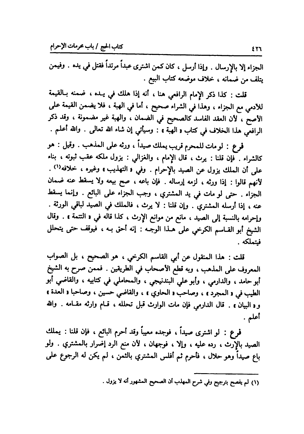 الجزاء إلا بالارسال. وإذا أرسل، كان كمن اشترى عبدا مرتدا فقتل في يده. وفيمن يتلف من ضمانه، خلاف موضعه كتاب البيع. قلت: كذا ذكر الامام الرافعي هنا، أنه إذا هلك في يده، ضمنه بالقيمة للآدمي مع الجزاء، وهذا في الشراء صحيح، أما في الهبة، فلا يضمن القيمة على الاصح، لان العقد الفاسد كالصحيح في الضمان، والهبة غير مضمونة، وقد ذكر الرافعي هذا الخلاف في كتاب الهبة: وسيأتي إن شاء الله تعالى. والله أعلم. فرع لو مات للمحرم قريب يملك صيدا، ورثه على المذهب. وقيل: هو كالشراء. فإن قلنا: يرث، قال الامام، والغزالي: يزول ملكه عقب ثبوته، بناء على أن الملك زول عن الصيد بالاحرام. وفي التهذيب وغيره، خلافه. لانهم قالوا: إذا ورثه، لزمه إرساله. فإن باعه، صح بيعه ولا يسقط عنه ضمان الجزاء. حتى لو مات في يد المشتري، وجب الجزاء على البائع. وإنما يسقط عنه، إذا أرسله المشتري. وإن قلنا: لا يرث، فالملك في الصيد لباقي الورثة. وإحرامه بالنسبة إلى الصيد، مانع من موانع الارث، كذا قاله في التتمة. وقال الشيخ أبو القاسم الكرخي على هذا الوجه: إنه أحق به، فيوقف حتى يتحلل فيتملكه. قلت: هذا المنقول عن أبي القاسم الكرخي، هو الصحيح، بل الصواب المعروف على المذهب، وبه قطع الاصحاب في الطريقين. فممن صرح به الشيخ أبو حامد، والدارمي وأبو علي البندنيجي، والمحاملي في كتابيه، والقاضي أبو الطيب في المجرد، وصاحب الحاوي، والقاضي حسين، وصاحبا العدة والبيان. قال الدارمي: فإن مات الوارث قبل تحلله، قام وارثه مقامه. والله أعلم. فرع لو اشترى صيدا، فوجده معيبا وقد أحرم البائع، فإن قلنا: يملك الصيد بالارث، رده عليه، وإلا، فوجهان، لان منع الرد إضرار بالمشتري. ولو باع صيدا وهو حلال،، فأحرم ثم أفلس المشتري بالثمن، لم يكن له الرجوع على