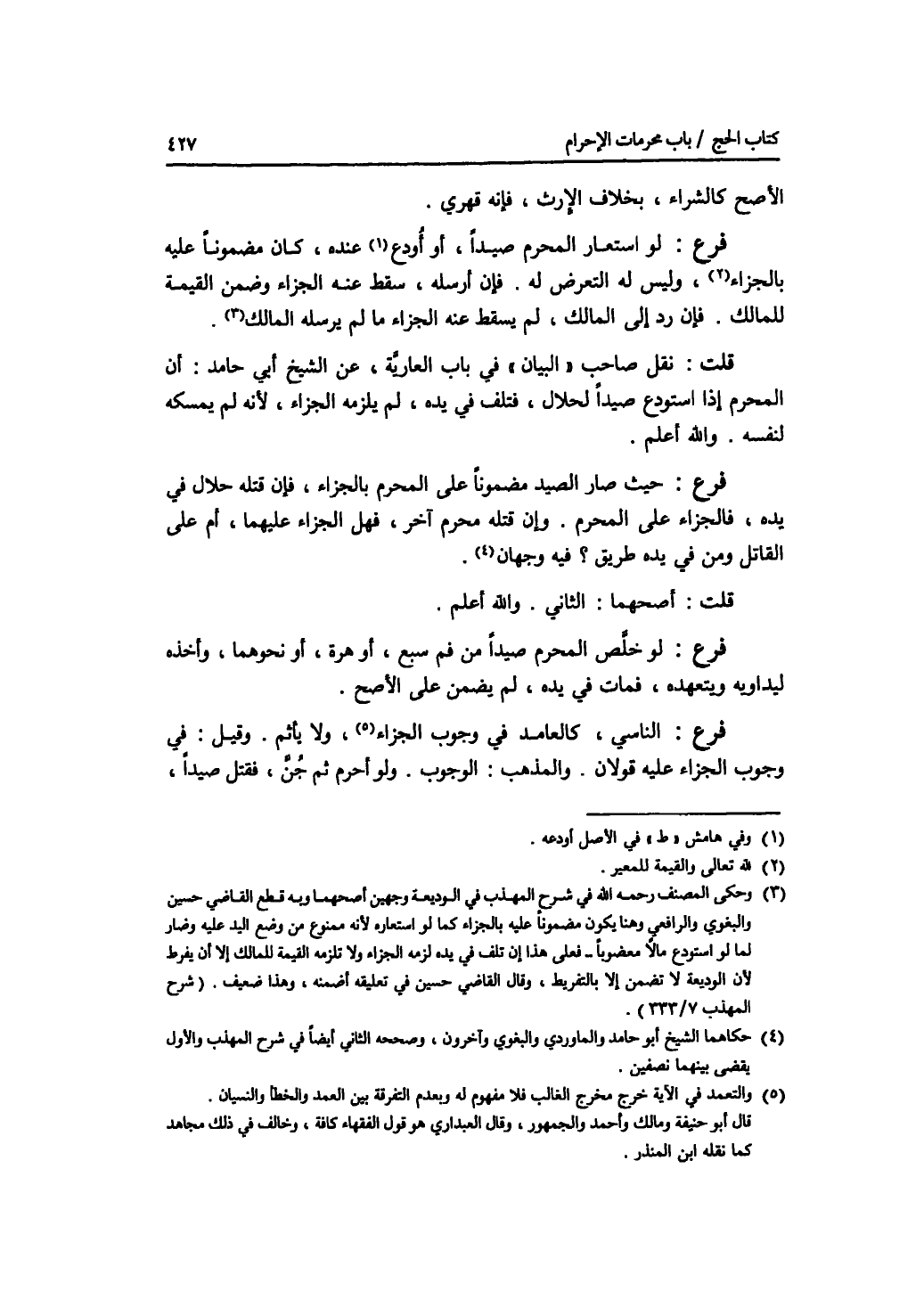الاصح كالشراء، بخلاف الارث، فإنه قهري. فرع لو استعار المحرم صيدا، أو أودع عنده، كان مضمونا عليه بالجزاء، وليس له التعرض له. فإن أرسله، سقط عنه الجزاء وضمن القيمة للمالك. فإن رد إلى المالك، لم يسقط عنه الجزاء ما لم يرسله المالك. قلت: نقل صاحب البيان في باب العارية، عن الشيخ أبي حامد: أن المحرم إذا استودع صيدا لحلال، فتلف في يده، لم يلزمه الجزاء، لانه لم يمسكه لنفسه. والله أعلم. فرع حيث صار الصيد مضمونا على المحرم بالجزاء، فإن قتله حلال في يده، فالجزاء على المحرم. وإن قتله محرم آخر، فهل الجزاء عليهما، أم على القاتل ومن في يده طريق ؟ فيه وجهان. قلت: أصحهما: الثاني. والله أعلم. فرع لو خلص المحرم صيدا من فم سبع، أو هرة، أو نحوهما، وأخذه ليداويه ويتعهده، فمات في يده، لم يضمن على الاظهر. فرع الناسي، كالعامد في وجوب الجزاء، ولا أثم. وقيل: في وجوب الجزاء عليه قولان. والمذهب: الوجوب. ولو أحرم ثم جن، فقتل صيدا،