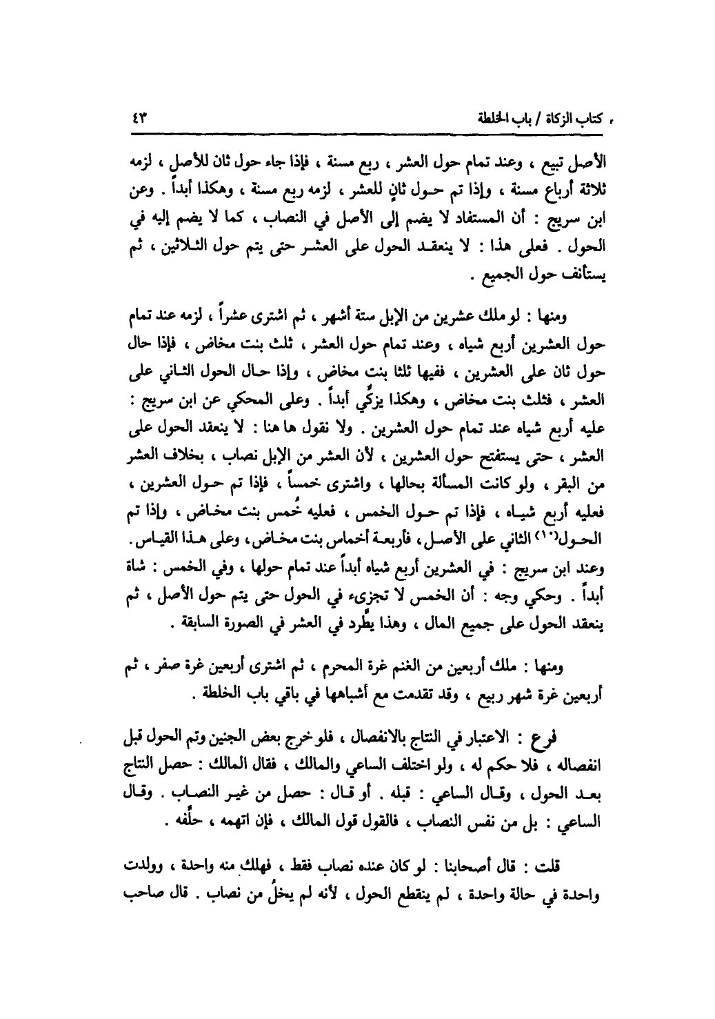 الاصل تبيع، وعند تمام حول العشر، ربع مسنة، فإذا جاء حول ثان للاصل، لزمه ثلاثة أرباع مسنة، وإذا تم حول ثان للعشر، لزمه ربع مسنة، وهكذا أبدا. وعن ابن سريج: أن المستفاد لا يضم إلى الاصل في النصاب، كما لا يضم إليه في الحول. فعلى هذا: لا ينعقد الحول على العشر حتى يتم حول الثلاثين، ثم يستأنف حول الجميع. ومنها: لو ملك عشرين من الابل ستة أشهر، ثم اشترى عشرا، لزمه عند تمام حول العشرين أربع شياه، وعند تمام حول العشر، ثلث بنت مخاض، فإذا حال حول ثان على العشرين، ففيها ثلثا بنت مخاض، وإذا حال الحول الثاني على العشر، فثلث بنت مخاض، وهكذا يزكي أبدا. وعلى المحكي عن ابن سريج: عليه أربع شياه عند تمام حول العشرين. ولا نقول هنا: لا ينعقد الحول على العشر، حتى يستفتح حول العشرين، لان العشر من الابل نصاب، بخلاف العشر من البقر، ولو كانت المسألة بحالها، واشترى خمسا، فإذا تم حول العشرين، فعليه أربع شياه، فإذا تم حول الخمس، فعليه خمس بنت مخاض، وإذا تم حول الثاني على الاصل، فأربعة أخماس بنت مخاض، وعلى هذا القياس. وعند ابن سريج: في العشرين أربع شياه أبدا عند تمام حولها، وفي الخمس: شاة أبدا. وحكي وجه: أن الخمس لا تجزئ في الحول حتى يتم حول الاصل، ثم ينعقد الحول على جميع المال، وهذا يطرد في العشر في الصورة السابقة. ومنها: ملك أربعين من الغنم غرة المحرم، ثم اشترى أربعين غرة صفر، ثم أربعين غرة شهر ربيع، وقد تقدمت مع أشباهها في باقي باب الخلطب. فرع الاعتبار في النتاج بالانفصال، فلو خرج بعض الجنين وتم الحول قبل انفصاله، فلا حكم له، ولو اختلف الساعي والمالك، فقال المالك: حصل النتاج بعد الحول، وقال الساعي: قبله. أو قال: حصل من غير النصاب. وقال الساعي: بل من نفس النصاب، فالقول قول المالك، فإن اتهمه، حلفه. قلت: قال أصحابنا: لو كان عنده نصاب فقط، فهلك منه واحدة، وولدت واحدة في حالة واحدة، لم ينقطع الحول، لانه لم يخل من نصاب. قال صاحب
