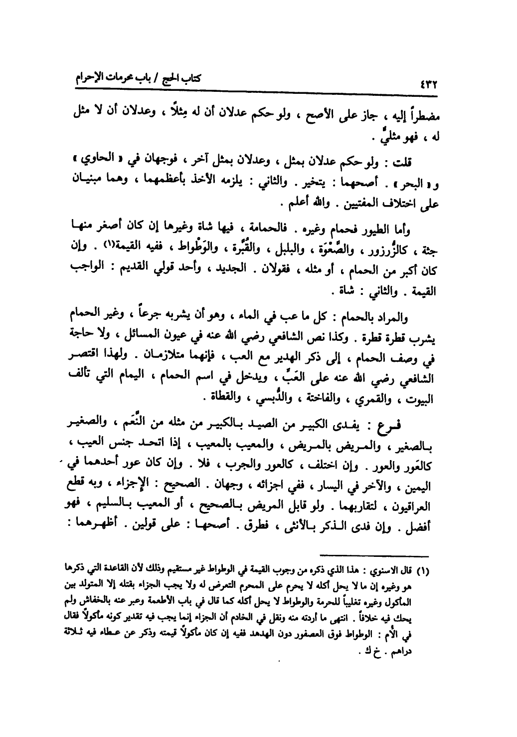 مضطرا إليه، جاز على الاصح، ولو حكم عدلان أن له مثلا، وعدلان أن لا مثل له، فهو مثلي. قلت: ولو حكم عدلان بمثل، وعدلان بمثل آخر، فوجهان في الحاوي والبحر. أصحهما: يتخير. والثاني: يلزمه الاخذ بأعظمهما، وهما مبنيان على اختلاف المفتيين. والله أعلم. وأما الطيور فحمام وغيره. فالحمامة، فيها شاة وغيرها إن كان أصغر منها جثة، كالزرزور، والصعوة، والبلبل، والقبرة، والوطواط ففيه القيمة. وإن كان أكبر من الحمام، أو مثله، فقولان. الجديد، وأحد قولي القديم: الواجب القيمة. والثاني: شاة، والمراد بالحمام: كل ما عب في الماء، وهو أن يشربه جرعا، وغير الحمام يشرب قطر قطرة. وكذا نص الشافعي رضي الله عنه في عيون المسائل، ولا حاجة في وصف الحمام، إلى ذكر الهدير مع العب، فإنهما متلازمان. ولهذا اقتصر الشافعي رضي الله عنه على العب، ويدخل في اسم الحمام، اليمام التي تألف البيوت، والقمري، والفاختة، والدبسي، والقطاة. فرع يفدى الكبير من الصيد بالكبير من مثله من النعم، والصغير بالصغير، والمريض بالمريض، والمعيب بالمعيب، إذا اتحد جنس العيب، كالعور والعور. وإن اختلف، كالعور والجرب، فلا. وإن كان عور أحدهما في اليمين، والآخر في اليسار، ففي إجزائه، وجهان. الصحيح: الاجزاء، وبه قطع العراقيون، لتقاربهما. ولو قابل المريض بالصحيح، أو المعيب بالسليم، فهو