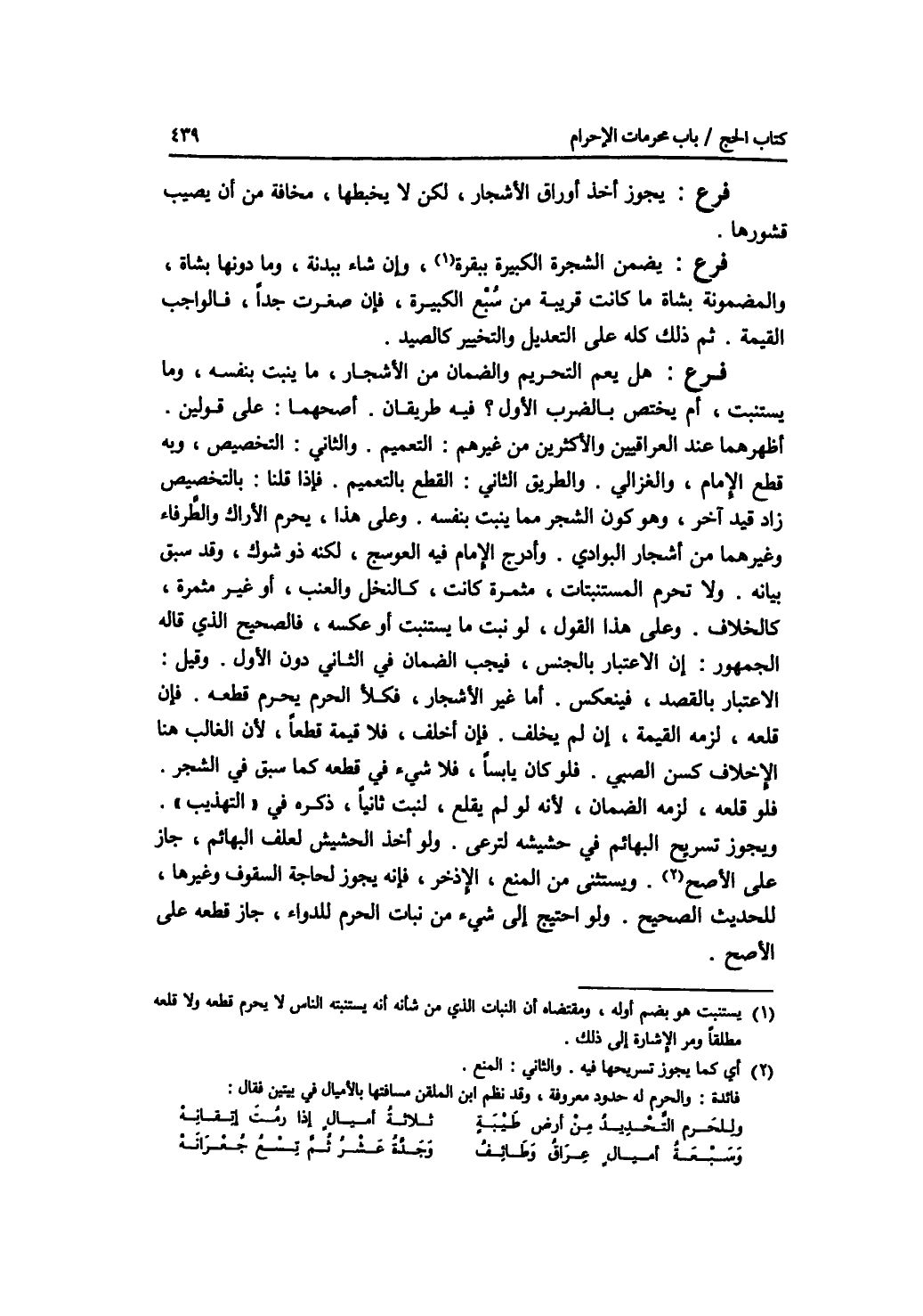 فرع يجوز أخذ أوراق الاشجار، لكن لا يخبطها، مخافة من أن يصيب قشورها. فرع يضمن الشجرة الكبيرة ببقرة، وإن شاء ببدنة، وما دونها بشاة، والمضمونة بشاة ما كانت قريبة من سبع الكبيرة، فإن صغرت جدا، فالواجب القيمة. ثم ذلك كله على التعديل والتخيير كالصيد. فرع هل يعم التحريم والضمان من الاشجار، ما ينبت بنفسه، وما يستنبت، أم يختص بالضرب الاول ؟ فيه طريقان. أصحهما: على قولين. أظهرهما عند العراقيين والاكثرين من غيرهم: التعميم. والثاني: التخصيص، وبه قطع الامام، والغزالي. والطريق الثاني: القطع بالتعميم. فإذا قلنا: بالتخصيص زاد قيد آخر، وهو كون الشجر مما ينبت بنفسه. وعلى هذا، يحرم الاراك والطرفاء وغيرهما من أشجار البوادي. وأدرج الامام فيه العوسج، لكنه ذو شوك، وقد سبق بيانه. ولا تحرم المستنبتات، مثمرة كانت، كالنخل والعنب، أو غير مثمرة، كالخلاف. وعلى هذا القول، لو نبت ما يستنبت أو عكسه، فالصحيح الذي قاله الجمهور: أن الاعتبار بالجنس، فيجب الضمان في الثاني دون الاول. وقيل: الاعتبار بالقصد، فينعكس. أما غير الاشجار، فكلا الحرم يحرم قطعه. فإن قلعه، لزمه القيمة، إن لم يخلف. فإن أخلف، فلا قيمة قطعا، لان الغالب هنا الاخلاف كسن الصبي. فلو كان يابسا، فلا شئ في قطعه كما سبق في الشجر. فلو قلعه، لزمه الضمان، لانه لو لم يقلع، لنبت ثانيا، ذكره في التهذيب. ويجوز تسريح البهائم في حشيشه لترعى. ولو أخذ الحشيش لعلف البهائم، جاز على الاصح. ويستثنى من المنع، الاذخر، فإنه يجوز لحاجة السقوف وغيرها، للحديث الصحيح.. ولو احتيج إلى شئ من نبات الحرم للدواء، جاز قطعه على الاصح.