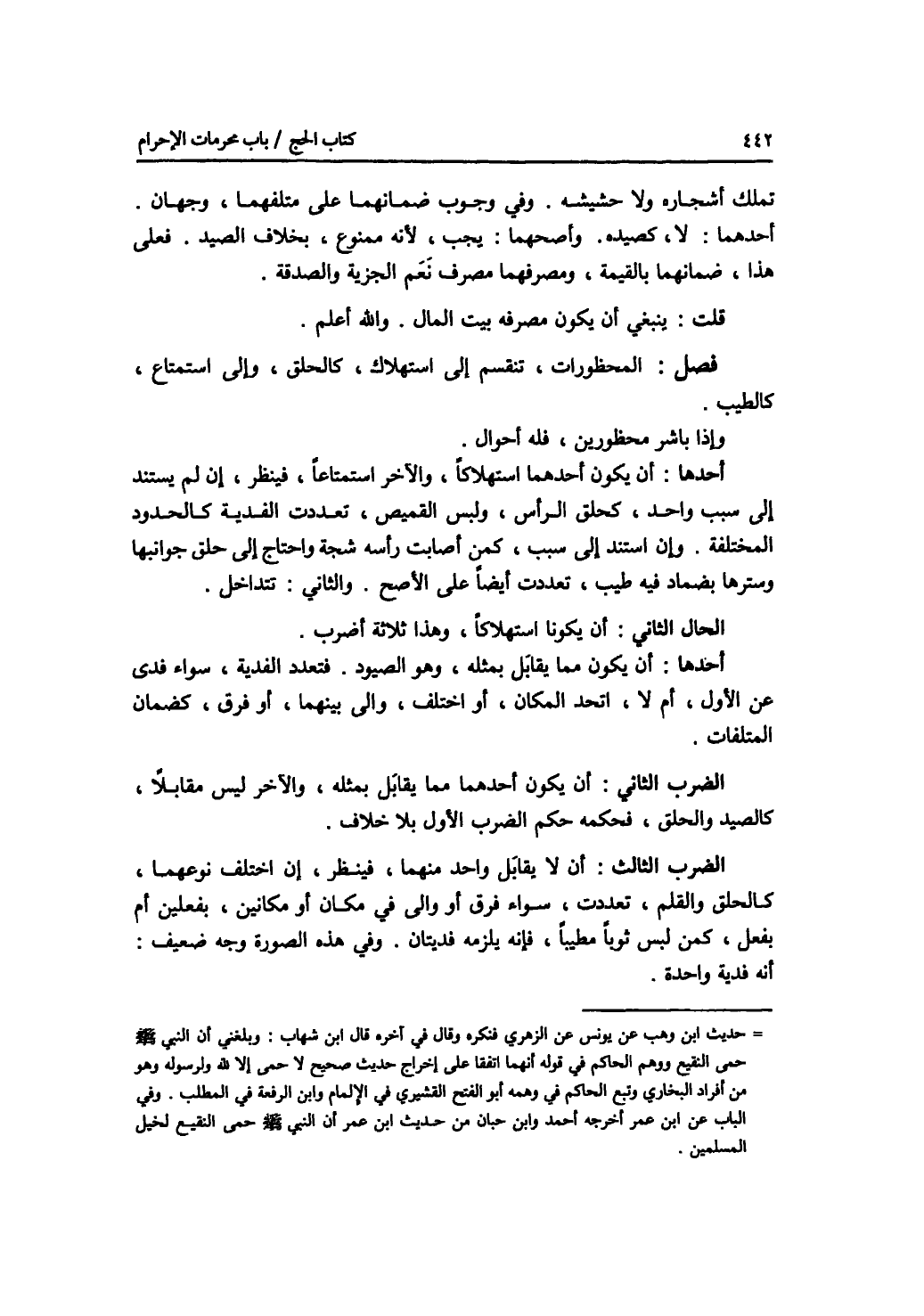 تملك أشجاره ولا حشيشه. وفي وجوب ضمانهما على متلفهما، وجهان. أحدهما: لا، كصيده. وأصحهما: يجب، لانه ممنوع، بخلاف الصيد. فعلى هذا، ضمانهما بالقيمة، ومصرفهما مصرف نعم الجزية والصدقة. قلت: ينبغي أن يكون مصرفه بيت المال. والله أعلم. فصل المحظورات، تنقسم إلى استهلاك، كالحلق، وإلى استمتاع، كالطيب. وإذا باشر محظورين. فله أحوال. أحدها: أن يكون أحدهما استهلاكا، والآخر استمتاعا، فينظر، إن لم يستند إلى سبب واحد، كحلق الرأس، ولبس القميص، تعددت الفدية كالحدود المختلفة. وإن استند إلى سبب، كمن أصابت رأسه شجة واحتاج إلى حلق جوانبها وسترها بضماد فيه طيب، تعددت أيضا على الاصح. والثاني: تتداخل. الحال الثاني: أن يكونا استهلاكا، وهذا ثلاثة أضرب. أحدها: أن يكون مما يقابل بمثله، وهو الصيود فتعدد الفدية، سواء فدى عن الاول، أم لا، اتحد المكان، أو اختلف، وإلى بينهما، أو فرق، كضمان المتلفات. الضرب الثاني: أن يكون أحدهما مما يقابل بمثله، والآخر ليس مقابلا، كالصيد والحلق، فحكمه حكم الضرب الاول بلا خلاف. الضرب الثالث: أن لا يقابل واحد منهما، فينظر، إن اختلف نوعهما، كالحلق والقلم، تعددت، سواء فرق أو والى في مكان أو مكانين، بفعلين أم بفعل، كمن لبس ثوبا مطيبا، فإنه يلزمه فديتان. وفي هذه الصورة وجه ضعيف: أنه فدية واحدة.