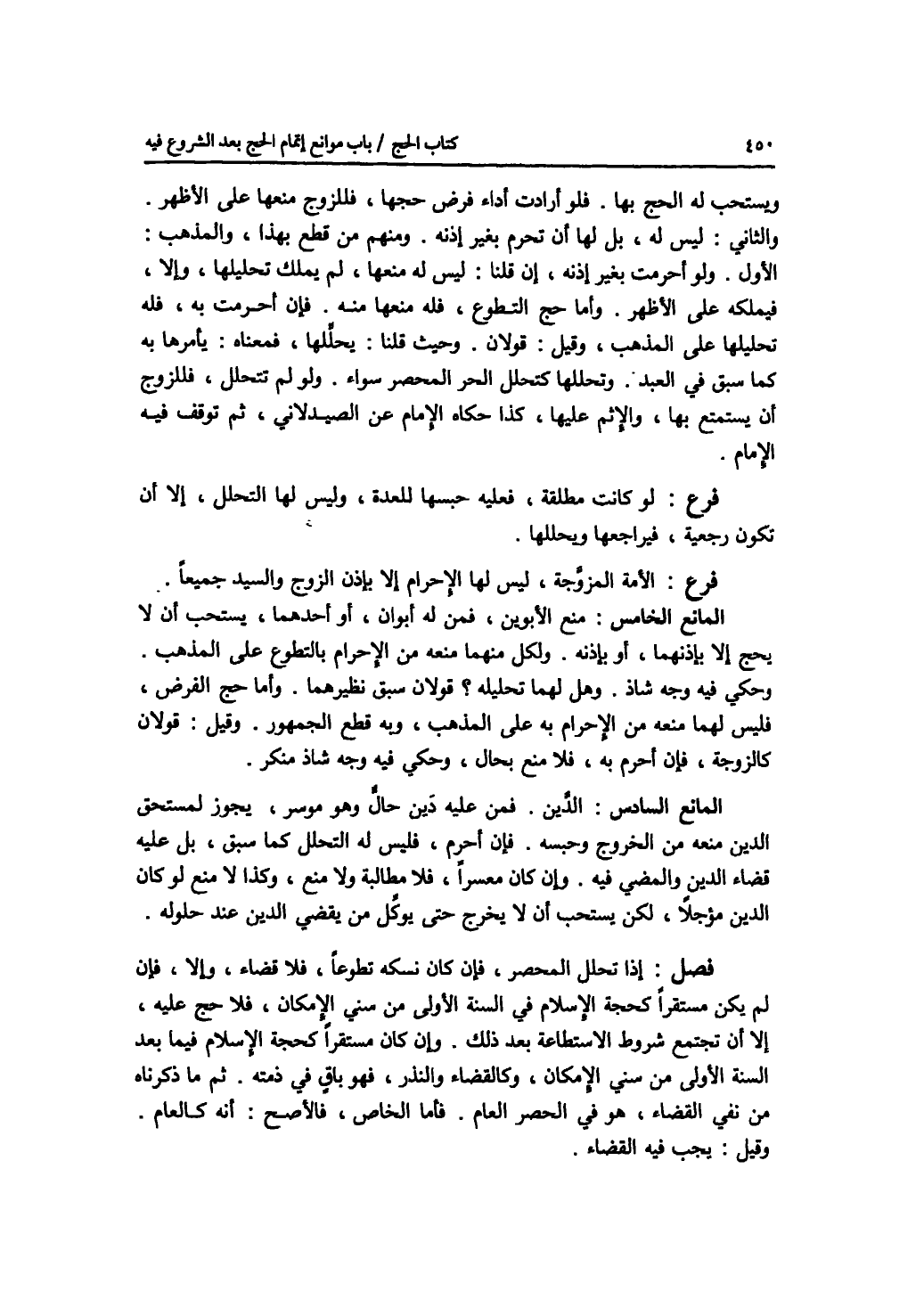 ويستحب له الحج بها. فلو أرادت أداء فرض حجها، فللزوج منعها على الاظهر. والثاني: ليس له، بل لها أن تحرم بغير إذنه. ومنهم من قطع بهذا، والمذهب: الاول. ولو أحرمت بغير إذنه، إن قلنا: ليس له منعها، لم يملك تحليلها، وإلا، فيملكه على الاظهر. وأما حج التطوع، فله منعها منه. فإن أحرمت به، فله تحليلها على المذهب، وقييل: قولان. وحيث قلنا: يحللها. فمعناه: يأمرها به كما سبق في العبد. وتحللها كتحلل الحر المحصر سواء. ولو لم تتحلل، فللزوج أن يستمتع بها، والاثم عليها، كذا حكاه الامام عن الصيدلاني، ثم توقف فيه الامام. فرع لو كانت مطلقة، فعليه حبسها للعدة، وليس لها التحلل، إلا أن تكون رجعية، فيراجعها ويحللها. فرع الامة المزوجة، ليس لها الاحرام إلا بإذن الزوج والسيد جميعا. المانع الخامس: منع الابوين، فمن له أبوان، أو أحدهما، يستحب أن لا يحج إلا بإذنهما، أو بإذنه. ولكل منهما منعه من الاحرام بالتطوع على المذهب. وحكي فيه وجه شاذ. وهل لهما تحليله ؟ قولان سبق نظيرهما. وأما حج الفرض، فليس لهما منعه من الاحرام به على المذهب، وبه قطع الجمهور. وقيل: قولان كالزوجة، فإن أحرم به، فلا منع بحال، وحكي فيه وجه شاذ منكر. المانع السادس: الدين. فمن عليه دين حال وهو موسر، يجوز لمستحق الدين منعه من الخروج وحبسه. فإن أحرم، فليس له التحلل كما سبق، بل عليه قضاء الدين والمضي فيه. وإن كان معسرا، فلا مطالبة ولا منع، وكذا لا منع لو كان الدين مؤجلا، لكن يستحب أن لا يخرج حتى يوكل من يقضي الدين عند حلوله. فصل إذا تحلل المحصر، فإن كان نسكه تطوعا، فلا قضاء، وإلا، فإن لم يكن مستقرا كحجة الاسلام في السنة الاولى من سني الامكان، فلا حج عليه، إلا أن تجتمع شروط الاستطاعة بعد ذلك. وإن كان مستقرا كحجة الاسلام فيما بعد السنة الاولى من سني الامكان، وكالقضاء والنذر، فهو باق في ذمته. ثم ما ذكرناه من نفي القضاء، هو في الحصر العام. فأما الخاص، فالاصح: أنه كالعام. وقيل: يجب فيه القضاء.