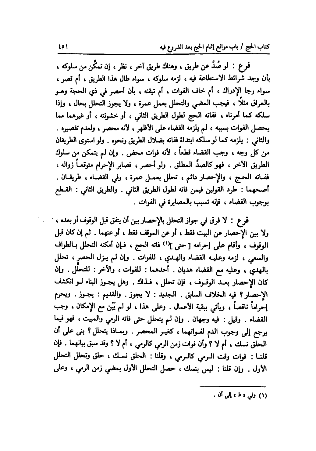 فرع لو صد عن طريق، وهناك طريق آخر، نظر، إن تمكن من سلوكه، بأن وجد شرائط الاستطاعة فيه، لزمه سلوكه، سواء طال هذا الطريق، أم قصر، سواء رجا الادراك، أم خاف الفوات، أم تيقنه، بأن أحصر في ذي الحجة وهو بالعراق مثلا، فيجب المضي والتحلل بعمل عمرة، ولا يجوز التحلل بحال، وإذا سلكه كما أمرناه، ففاته الحج لطول الطريق الثاني، أو خشونته، أو غيرهما مما يحصل الفوات بسببه، لم يلزمه القضاء على الاظهر، لانه محصر، ولعدم تقصيره. والثاني: يلزمه كما لو سلكه ابتداء ففاته بضلال الطريق ونحوه. ولو استوى الطريقان من كل وجه، وجب القضاء قطعا، لانه فوات محض. وإن لم يتمكن من سلوك الطريق الآخر، فهو كالصد المطلق. ولو أحصر، فصابر الاحرام متوقعا زواله، ففاته الحج، والاحصار دائم، تحلل بعمل عمرة، وفي القضاء، طريقان. أصحهما: طرد القولين فيمن فاته لطول الطريق الثاني. والطريق الثاني: القطع بوجوب القضاء، فإنه تسبب بالمصابرة في الفوات. فرع لا فرق في جواز التحلل بالاحصار بين أن يتفق قبل الوقوف أو بعده، ولا بين الاحصار عن البيت فقط، أو عن الموقف فقط، أو عنهما. ثم إن كان قبل الوقوف، وأقام على إحرامه إلى أن فاته الحج، فإن أمكنه التحلل بالطواف والسعي، لزمه وعليه القضاء والهدي، للفوات. وإن لم يزل الحصر، تحلل بالهدي، وعليه مع القضاء هديان. أحدهما: للفوات، والآخر: للتحلل. وإن كان الاحصار بعد الوقوف، فإن تحلل، فذاك. وهل يجوز البناء لو انكشف الاحصار ؟ فيه الخلاف السابق. الجديد: لا يجوز. والقديم: يجوز. ويحرم إحراما ناقصا ويأتي ببقية الاعمال. وعلى هذا، لو لم يبن مع الامكان، وجب القضاء. وقيل: فيه وجهان. وإن لم يتحلل حتى فاته الرمي والمبيت، فهو فيما يرجع إلى وجوب الدم لفواتهما، كغير المحصر. وبماذا يتحلل ؟ بني على أن الحلق نسك، أم لا ؟ وأن فوات زمن الرمي كالرمي، أم لا ؟ وقد سبق بيانهما. فإن قلنا: فوات وقت الرمي كالرمي، وقلنا: الحلق نسك، حلق وتحلل التحلل الاول. وإن قلنا: ليس بنسك، حصل التحلل الاول بمضي زمن الرمي، وعلى