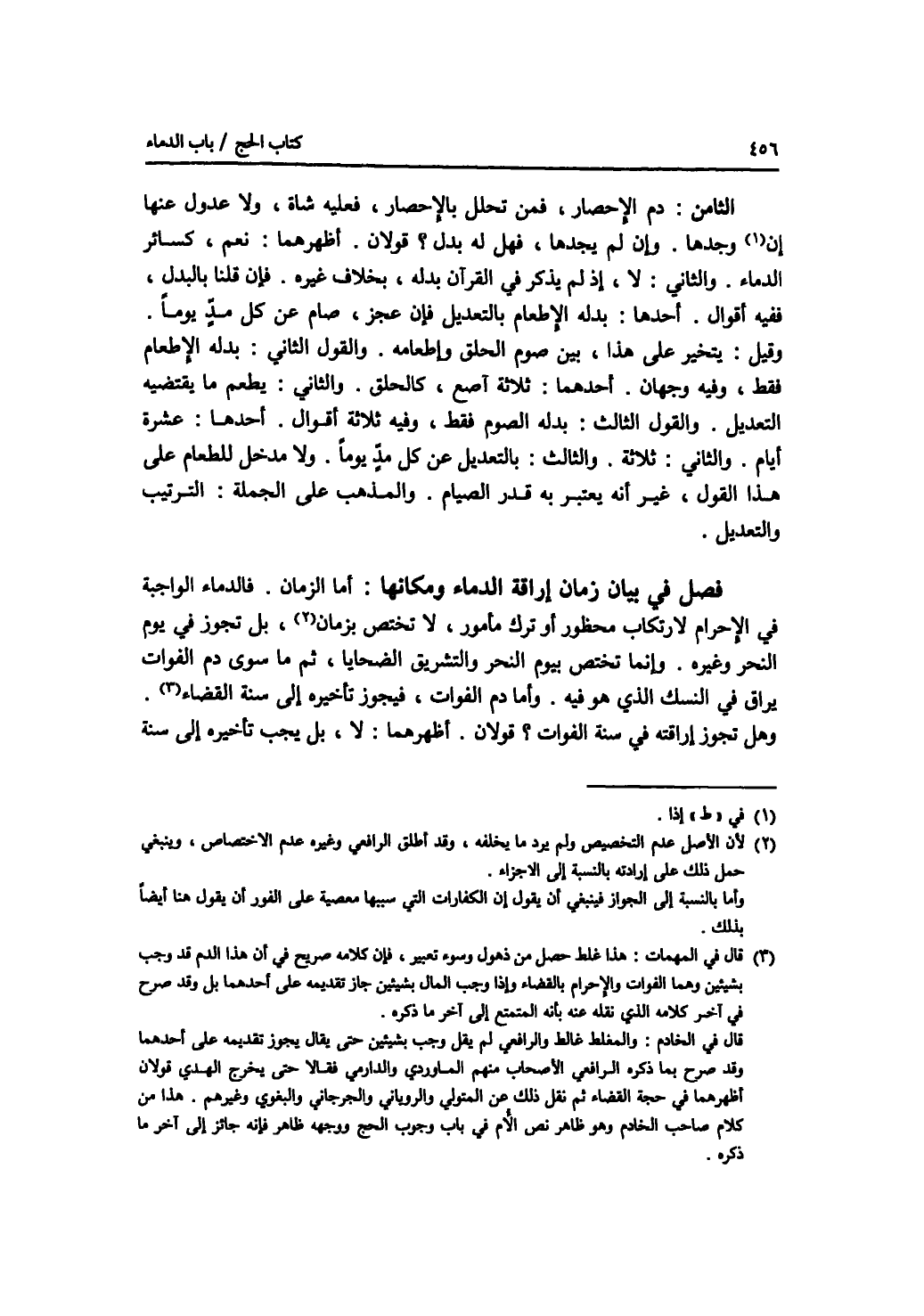 الثامن: دم الاحصار، فمن تحلل بالاحصار، فعليه شاة، ولا عدول عنها إذا وجدها. وإن لم جدها، فهل له بدل ؟ قولان. أظهرهما: نعم، كسائر الدماء. والثاني: لا، إذ لم يذكر في القرآن بدله، بخلاف غيره. فإن قلنا بالبدل، ففيه أقوال. أحدها: بدله الاطعام بالتعديل. فإن عجز، صام عن كل مد يوما. وقيل: يتخير على هذا، بين صوم الحلق وإطعامه. والقول الثاني: بدله الاطعام فقط، وفيه وجهان. أحدهما: ثلاثة آصع، كالحلق. والثاني: يطعم ما يقتضيه التعديل. والقول الثالث: بدله الصوم فقط،، وفيه ثلاثة أقوال. أحدها: عشرة أيام. والثاني: ثلاثة. والثالث: بالتعديل عن كل مد يوما. ولا مدخل للطعام على هذا القول، غير أنه يعتبر به قدر الصيام. والمذهب على الجملة: الترتيب والتعديل. فصل في بان زمان إراقة الدماء ومكانها أما الزمان: فالدماء الواجبة في الاحرام لارتكاب محظور أو ترك مأمور، لا تختص بزمان، بل تجوز في يوم النحر وغيره. وإنما تختص بيوم النحر والتشريق الضحايا، ثم ما سوى دم الفوات يراق في النسك الذي هو فيه. وأما دم الفوات، فيجوز تأخيره إلى سنة القضاء. وهل تجوز إراقته في سنة الفوات ؟ قولان. أظهرهما: لا، بل يجب تأخيره إلى سنة