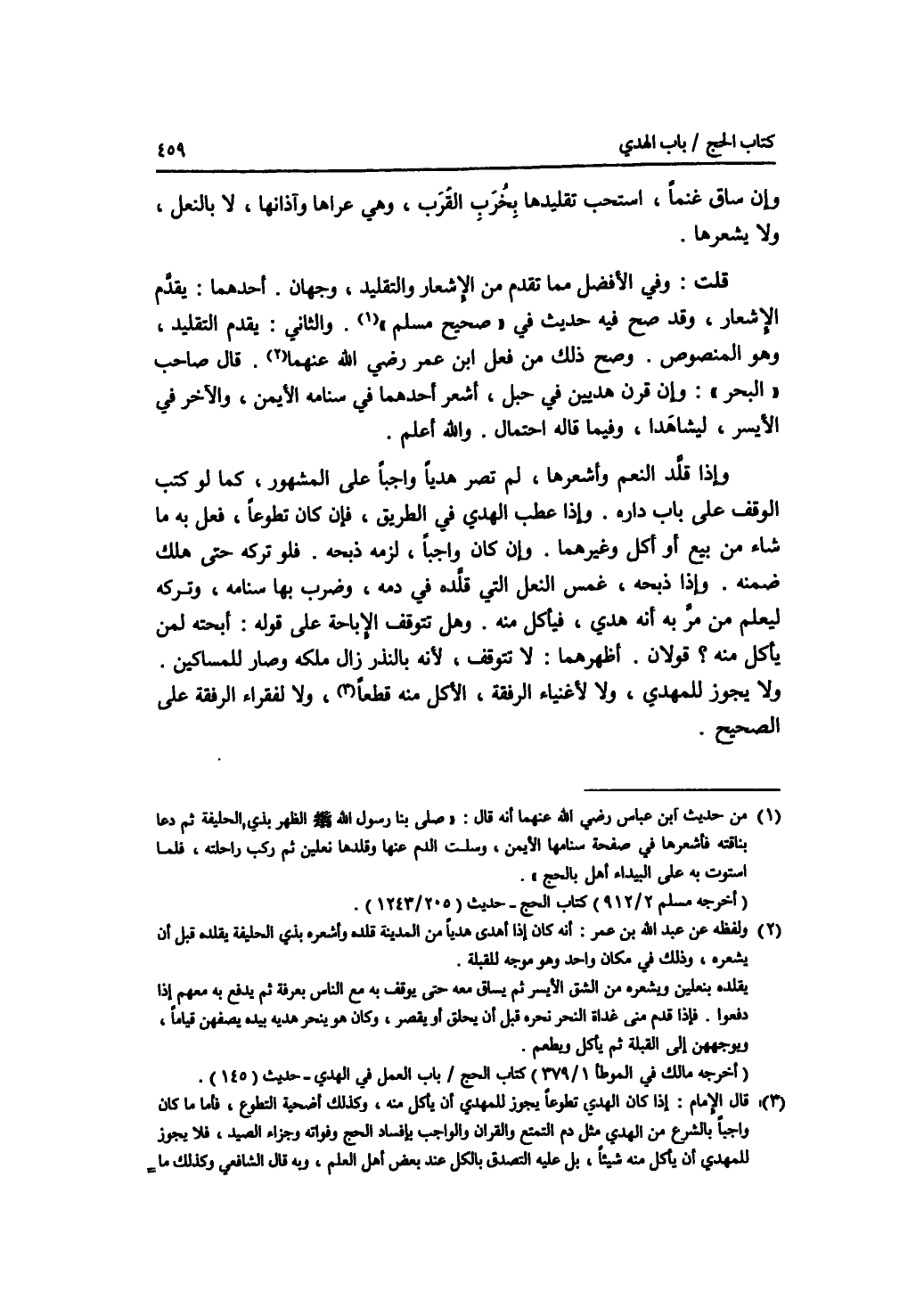 وإن ساق غنما، استحب تقليدها بخرب القرب، وهي عراها وآذانها، لا بالنعل، ولا يشعرها. قلت: وفي الافضل مما يقدم من الاشعار والتقليد، وجهان. أحدهما: يقدم الاشعار، وقد صح فيه حديث في صحيح مسلم والثاني: يقدم التقليد، وهو المنصوص. وصح ذلك من فعل ابن عمر رضي الله عنهما. قال صاحب البحر: وإن قرن هديين في حبل، أشعر أحدهما في سنامه الايمن، والآخر في الايسر، ليشاهدا، وفيما قاله احتمال. والله أعلم. وإذا قلد النعم وأشعرها، لم تصر هديا واجبا على المشهور، كما لو كتب الوقف على باب داره. وإذا عطب الهدي في الطريق، فإن كان تطوعا، فعل به ما شاء من بيع أو أكل وغيرهما. وإن كان واجبا، لزمه ذبحه. فلو تركه حتى هلك ضمنه. وإذا ذبحه، غمس النعل التي قلده في دمه، وضرب بها سنامه، وتركه ليعلم من مر به أنه هدي، يأكل منه. وهل تتوقف الاباحة على قوله: أبحته لمن يأكل منه ؟ قولان. أظهرهما: لا تتوقف، لانه بالنذر زال ملكه وصار للمساكين. ولا يجوز للمهدي، ولا لاغنياء الرفقة، الاكل منه قطعا، ولا لفقراء الرفقة على الصحيح.