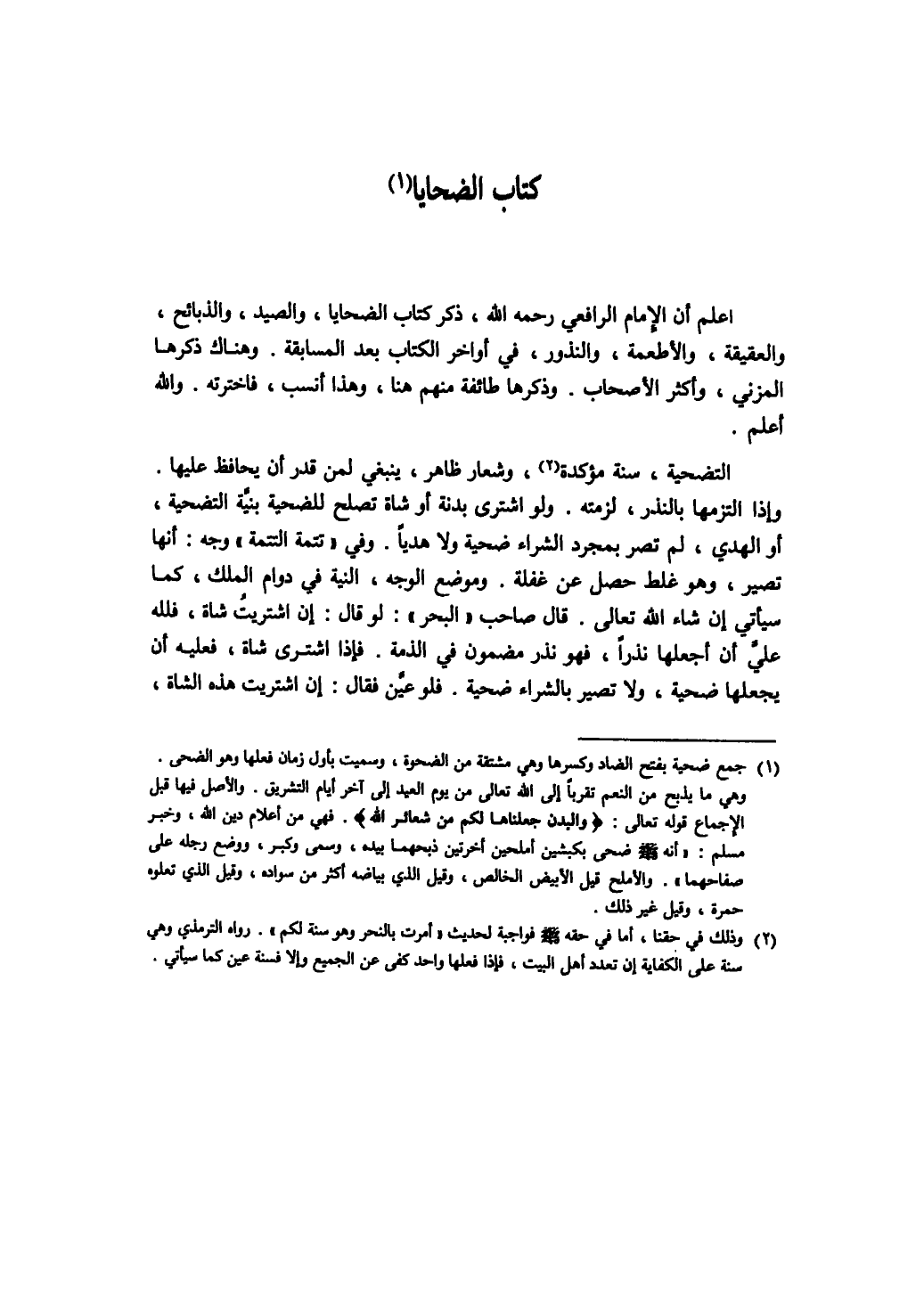 اعلم أن الامام الرافعي رحمه الله، ذكر كتاب الضحايا، والصيد والذبائح، والعقيقة، والاطعمة، والنذور، في أواخر الكتاب بعد المسابقة. وهناك ذكرها المزني، وأكثر الاصحاب. وذكرها طائفة منهم هنا، وهذا أنسب، فاخترته. والله أعلم. التضحية، سنة مؤكدة، وشعار ظاهر، ينبغي لمن قدر أن يحافظ عليها. وإذا التزمها بالنذر، لزمته. ولو اشترى بدنة أو شاة تصلح للضحية بنية التضحية، أو الهدي، لم تصر بمجرد الشراء ضحية ولا هديا. وفي تتمة التتمة وجه: أنها تصير، وهو غلط حصل عن غفلة. وموضع الوجه، النية في دوام الملك، كما سيأتي إن شاء الله تعالى. قال صاحب البحر: لو قال: إن اشتريت شاة، فلله علي أن أجعلها نذرا، فهو نذر مضمون في الذمة. فإذا اشترى شاة، فعليه أن يجعلها ضحية، ولا تصير بالشراء ضحية، فلو عين فقال: إن اشتريت هذه الشاة،