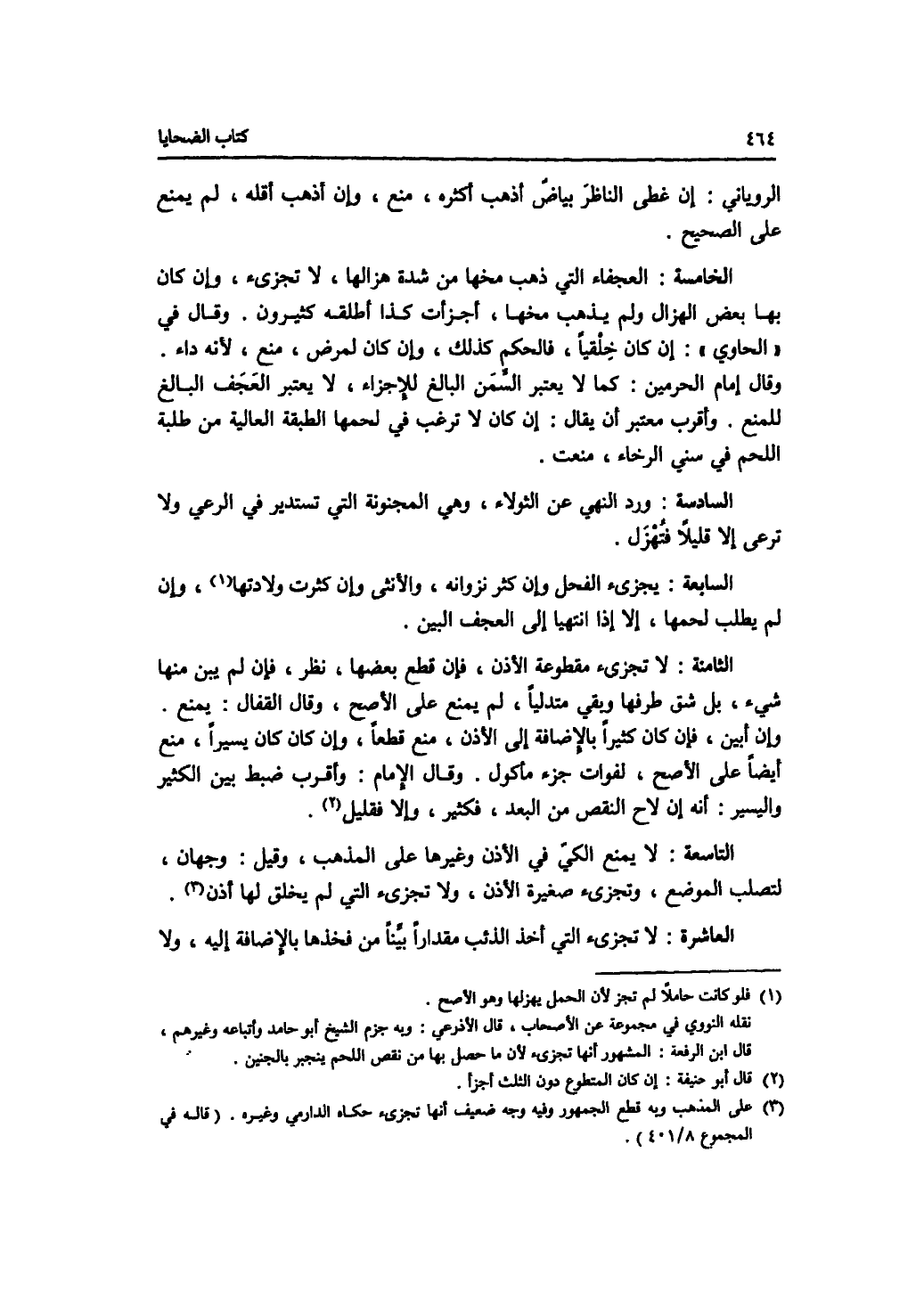 الروياني إن غطى بياض، أذهب أكثره منع وإن أذهب أقله، لم يمنع على الصحيح. الخامسة: العجفاء التي ذهب مخها من شدة هزالها، لا تجزئ، وإن كان بها بعض الهزال ولم يذهب مخها، أجزأت، كذا أطلقه كثيرون. وقال في الحاوي: إن كان خلقيا، فالحكم كذلك، وإن كان لمرض، منع، لانه داء. وقال إمام الحرمين: كما لا يعتبر السمن البالغ للاجزاء، لا يعتبر العجف البالغ للمنع. وأقرب معتبر أن يقال: إن كان لا ترغب في لحمها الطبقة العالية من طلبة اللحم في سني الرخاء، منعت. السادسة: ورد النهي عن الثولاء، وهي المجنونة التي تستدير في الرعي ولا ترعى إلا قليلا فتهزل. السابعة: يجزئ الفحل وإن كثر نزوانه، والانثى وإن كثرت ولادتها، وإن لم يطلب لحمها، إلا إذا انتهيا إلى العجف البين. الثامنة: لا تجزئ مقطوعة الاذن، فإن قطع بعضها، نظر، فإن لم يبن منها شئ، بل شق طرفها وبقي متدليا، لم يمنع على الاصح، وقال القفال: يمنع. وإن أبين، فإن كان كثيرا بالاضافة إلى الاذن، منع قطعا، وإن كان يسيرا، منع أيضا على الاصح، لفوات جزء مأكول. وقال الامام: وأقرب ضبط بين الكثير واليسير: أنه إن لاح النقص من البعد، فكثير، وإلا فقليل. التاسعة: لا يمنع الكي في الاذن وغيرها على المذهب، وقيل: وجهان، لتصلب الموضع، وتجزئ صغيرة الاذن، ولا تجزئ التي لم يخلق لها أذن. العاشرة: لا تجزئ التي أخذ الذئب مقدارا بينا من فخذها بالاضافة إليه، ولا