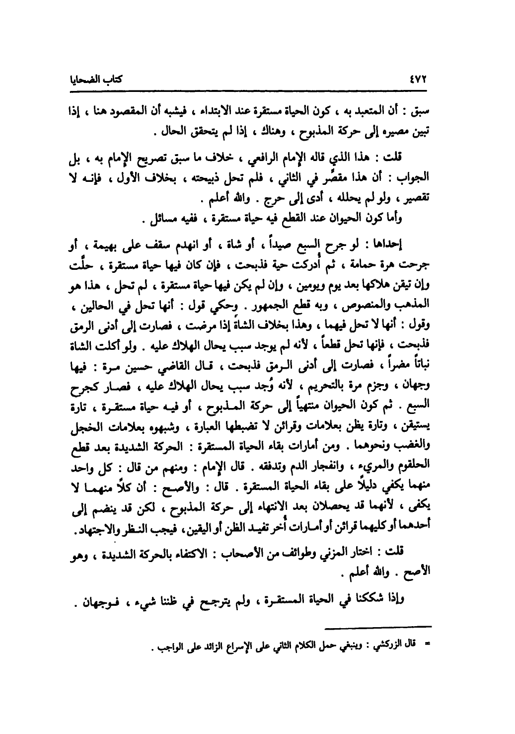 سبق: أن المتعبد به، كون الحياة مستقرة عند الابتداء، فيشبه أن المقصود هنا، إذا تبين مصيره إلى حركة المذبوح، وهناك، إذا لم يتحقق الحال. قلت: هذا الذي قاله الامام الرافعي، خلاف ما سبق تصريح الامام به، بل الجواب: أن هذا مقصر في الثاني، فلم تحل ذبيحته، بخلاف الاول فإنه لا تقصير، ولو لم يحلله، أدى إلى حرج. والله أعلم. وأما كون الحيوان عند القطع فيه حياة مستقرة، ففيه مسائل. إحداها: لو جرح السبع صيدا، أو شاة، أو انهدم سقف على بهيمة أو جرحت هرة حمامة، ثم أدركت حية فذبحت، فإن كان فيها حياة مستقرة، حلت وإن تيقن هلاكها بعد يوم ويومين، وإن لم يكن فيها حياة مستقرة، لم تحل، هذا هو المذهب والمنصوص، وبه قطع الجمهور. وحكي قول: أنها تحل في الحالين، وقول: أنها لا تحل فيهما، وهذا بخلاف الشاة إذا مرضت، فصارت إلى أدنى الرمق فذبحت، فإنها تحل قطعا، لانه لم يوجد سبب يحال الهلاك عليه. ولو أكلت الشاة نباتا مضرا، فصارت إلى أدنى الرمق فذبحت، قال القاضي حسين مرة: فيها وجهان، وجزم مرة بالتحريم، لانه وجد سبب يحال الهلال عليه، فصار كجرح السبع. ثم كون الحيوان منتهيا إلى حركة المذبوح، أو فيه حياة مستقرة، تارة يستيقن، وتارة يظن بعلامات وقرائن لا تضبطها العبارة، وشبهوه بعلامات الخجل والغضب ونحوهما. ومن أمارات بقاء الحياة المستقرة: الحركة الشديدة بعد قطع الحلقوم والمرئ، وانفجار الدم وتدفقه. قال الامام: ومنهم من قال: كل واحد منهما يكفي دليلا على بقاء الحياة المستقرة. قال: والاصح: أن كلا منهما لا يكفي، لانهما قد يحصلان بعد الانتهاء إلى حركة المذبوح، لكن قد ينضم إلى أحدهما أو كليهما قرائن أو أمارات أخر تفيد الظن أو اليقين، فيجب النظر والاجتهاد. قلت: اختار المزني وطوائف من الاصحاب: الاكتفاء بالحركة الشديدة، وهو الاصح. والله أعلم. وإذا شككنا في الحياة المستقرة، ولم يترجح في ظننا شئ، فوجهان.