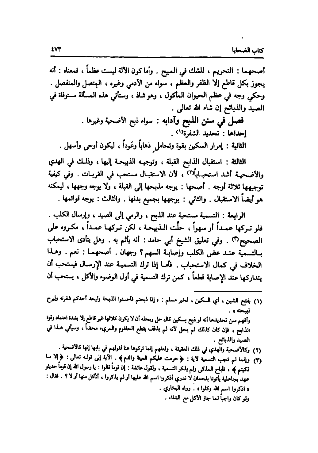 فصل في سنن الذبح وآدابه سواء ذبح الاضحية وغيرها. إحداها: تحديد الشفرة. الثانية: إمرار السكين بقوة وتحامل ذهابا وعودا، ليكون أوحى وأسهل. الثالثة: استقبال الذابح القبلة، وتوجيه الذبيحة إليها، وذلك في الهدي والاضحية أشد استحبابا، لان الاستقبال مستحب في القربات. وفي كيفية توجيهها ثلاثة أوجه. أصحها: يوجه مذبحها إلى القبلة، ولا يوجه وجهها، ليمكنه هو أيضا الاستقبال. والثاني: يوجهها بجميع بدنها. والثالث: يوجه قوائمها. الرابعة: التسمية مستحبة عند الذبح، والرمي إلى الصيد، وإرسال الكلب. فلو تركها عمدا أو سهوا، حلت الذبيحة، لكن تركها عمدا، مكروه على الصحيح. وفي تعليق الشيخ أبي حامد: أنه يأثم به. وهل يتأدى الاستحباب بالتسمية عند عض الكلب وإصابة السهم ؟ وجهان. أصحهما: نعم. وهذا الخلاف في كمال الاستحباب. فأما إذا ترك التسمية عند الارسال فيستحب أن يتداركها عند الاصابة قطعا، كمن ترك التسمية في أول الوضوء والاكل، يستحب أن