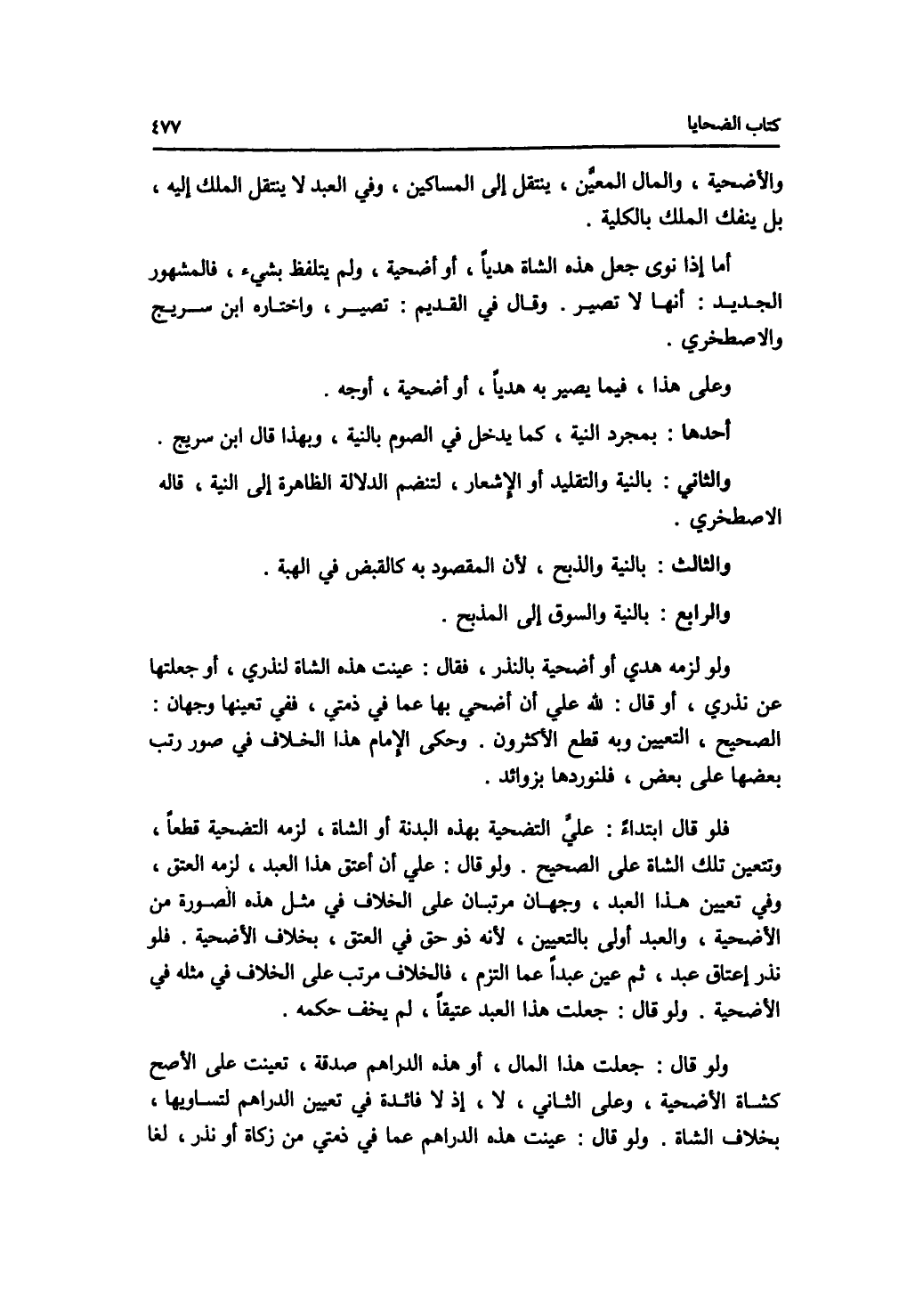 والاضحية، والمال المعين، ينتقل إلى المساكين، وفي العبد لا ينتقل الملك إليه، بل ينفك الملك بالكلية. أما إذا نوى جعل هذه الشاة هديا، أو أضحية، ولم يتلفظ بشئ، فالمشهور الجديد: أنها لا تصير. وقال في القديم: تصير، واختاره ابن سريح والاصطخري. وعلى هذا، فيما يصير به هديا، أو أضحية، أوجه. أحدها: بمجرد النية، كما يدخل في الصوم بالنية، وبهذا قال ابن سريج. والثاني: بالنية والتقليد أو الاشعار، لتنضم الدلالة الظاهرة إلى النية، قاله الاصطخري. والثالث: بالنية والذبح، لان المقصود به كالقبض في الهبة. والرابع: بالنية والسوق إلى المذبح. ولو لزمه هدي أو أضحية بالنذر، فقال: عينت هذه الشاة لنذري، أو جعلتها عن نذري، أو قال: لله علي أن أضحي بها عما في ذمتي، ففي تعينها وجهان: الصحيح، التعين وبه قطع الاكثرون. وحكى الامام هذا الخلاف في صور رتب بعضها على بعض، فلنوردها بزوائد. فلو قال ابتداء: علي التضحية بهذه البدنة أو الشاة، لزمه التضحية قطعا، وتتعين تلك الشاة على الصجيح. ولو قال: علي أن أعتق هذا العبد، لزمه العتق، وفي تعيين هذا العبد، وجهان مرتبان على الخلاف في مثل هذه الصورة من الاضحية، والعبد أولى بالتعيين، لانه ذو حق في العتق، بخلاف الاضحية. فلو نذر إعتاق عبد، ثم عين عبدا عما التزم، فالخلاف مرتب على الخلاف في مثله في الاضحية. ولو قال: جعلت هذا العبد عتيقا، لم يخف حكمه، ولو قال: جعلت هذا المال، أو هذه الدراهم صدقة، تعينت على الاصح كشاة الاضحية، وعلى الثاني، لا، إذ لا فائدة في تعيين الدراهم لتساويها، بخلاف الشاة. ولو قال: عينت هذه الدراهم عما في ذمتي من زكاة أو نذر، لغا