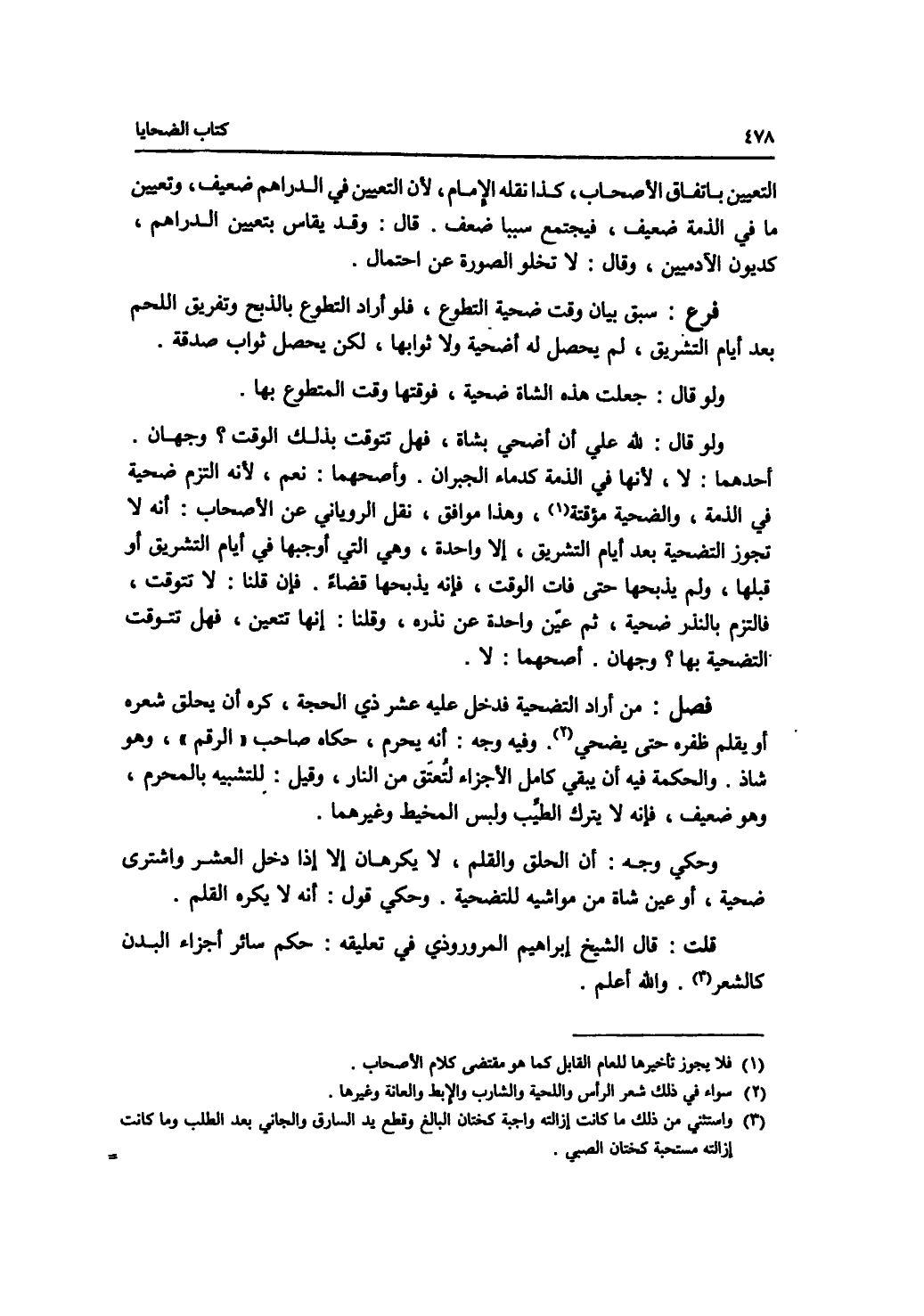 التعيين باتفاق أصحاب، كذا نقله الامام، لان التعيين في الدراهم ضعيف، وتعيين ما في الذمة ضعيف، فيجتمع سببا ضعف. قال: وقد يقاس بتعيين الدراهم، كديون الآدميين، وقال: لا تخلو الصورة عن احتمال. فرع سبق بيان وقت ضحية التطوع، فلو أراد التطوع بالذبح وتفريق اللحم بعد أيام التشريق، لم يحصل له أضحية ولا ثوابها، لكن يحصل ثواب صدقة. ولو قال: جعلت هذه الشاة ضحية، فوقتها وقت المتطوع بها. ولو قال: لله علي أن أضحي بشاة، فهل تتوقت بذلك الوقت ؟ وجهان. أحدهما: لا، لانها في الذمة كدماء الجبران. وأصحهما: نعم، لانه التزم ضحية في الذمة، والضحية مؤقتة، وهذا موافق، نقل الروياني عن الاصحاب: أنه لا تجوز التضحية بعد أيام التشريق، إلا واحدة، وهي التي أوجبها في أيام التشريق أو قبلها، ولم يذبحها حتى فات الوقت، فإنه يذبحها قضاء. فإن قلنا: لا تتوقت، فالتزم بالنذر ضحية، ثم عين واحدة عن نذره، وقلنا: إنها تتعين، فهل تتوقت التضحية بها ؟ وجهان. أصحهما: لا.