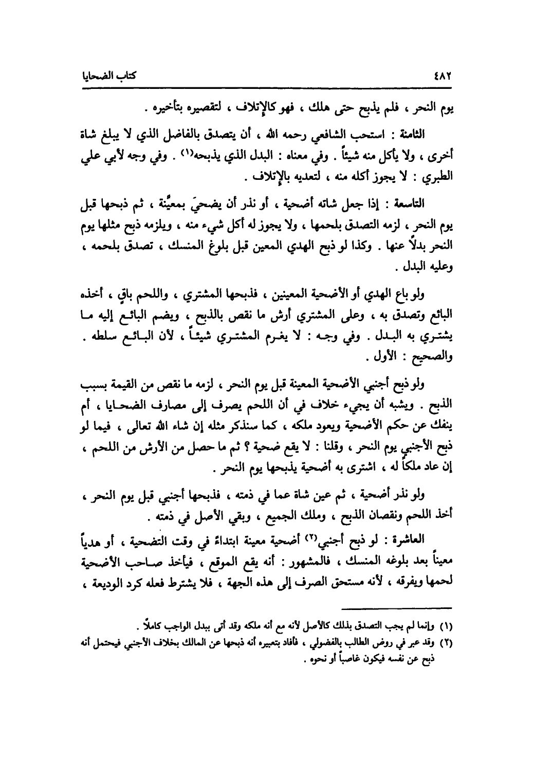 يوم النحر، فلم يذبح حتى هلك، فهو كالاتلاف لتقصيره بتأخيره. الثامنة: استحب الشافعي رحمه الله، أن يتصدق بالفاضل الذي لا يبلغ شاة أخرى، ولا يأكل منه شيئا. وفي معناه: البدل الذي يذبحه. وفي وجه لابي علي الطبري: لا يجوز أكله منه، لتعديه بالاتلاف. التاسعة: إذا جعل شاته أضحية، أو نذر أن يضحي بمعينة، ثم ذبحها قبل يوم النحر، لزمه التصدق بلحمها، ولا يجوز له أكل شئ منه، ويلزمه ذبح مثلها يوم النحر بدلا عنها. وكذا لو ذبح الهدي المعين قبل بلوغ المنسك، تصدق بلحمه، وعليه البدل. ولو باع الهدي أو الاضحية المعينين، فذبحها المشتري، واللحم باق، أخذه البائع وتصدق به، وعلى المشترى أرش ما نقص بالذبح، ويضم البائع إليه ما يشترى به البدل. وفي وجه: لا يغرم المشتري شيئا، لان البائع سلطه. والصحيح: الاول. ولو ذبح أجنبي الاضحية المعينة قبل يوم النحر لزمه ما نقص من القيمة بسبب الذبح. ويشبه أن يجئ خلاف في أن اللحم يصرف إلى مصارف الضحايا، أم ينفك عن حكم الاضحية ويعود ملكه، كما سنذكر مثله إن شاء الله تعالى، فيما لو ذبح الاجنبي يوم النحر، وقلنا: لا يقع ضحية ؟ ثم ما حصل من الارش من اللحم، إن عاد ملكا له، اشترى به أضحية يذبحها يوم النحر. ولو نذر أضحية، ثم عين شاة عما في ذمته، فذبحها أجنبي قبل يوم النحر، أخذ اللحم ونقصان الذبح، وملك الجميع، وبقي الاصل في ذمته. العاشرة: لو ذبح أجنبي أضحية معينة ابتداء في وقت التضحية، أو هديا معينا بعد بلوغه المنسك، فالمشهور: أنه يقع الموقع، فيأخذ صاحب الاضحية لحمها ويفرقه، لانه مستحق الصرف إلى هذه الجهة فلا يشترط فعله كرد الوديعة،