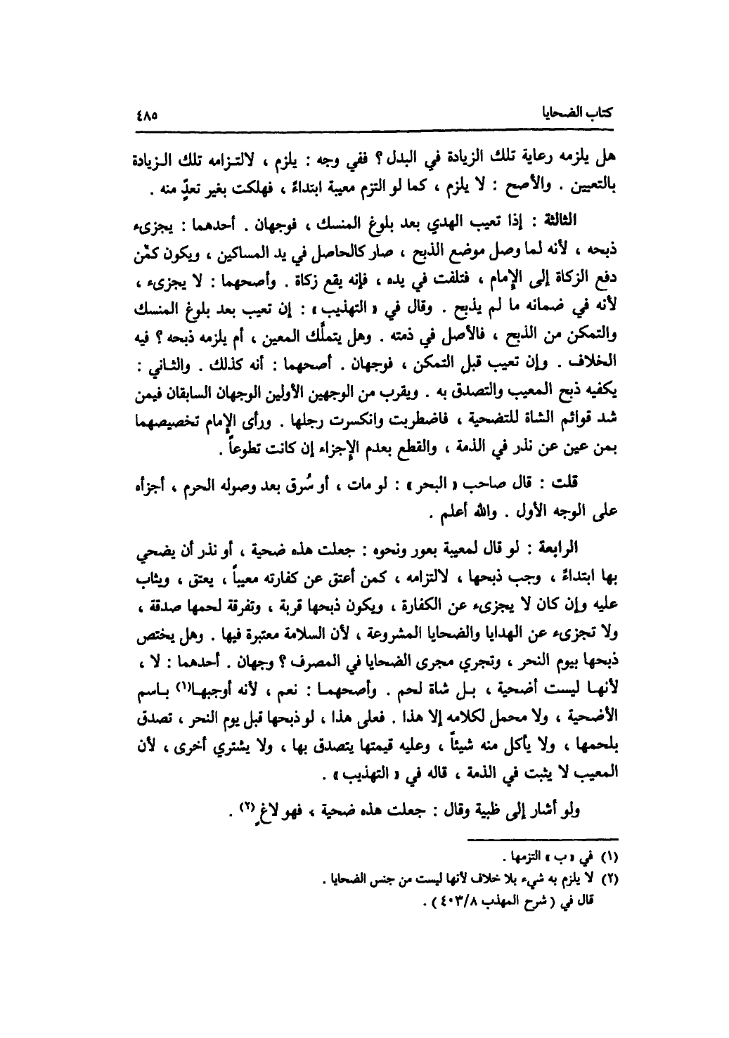 هل يلزمه رعاية تلك الزيادة في البدل ؟ ففي وجه: يلزم، لالتزامه تلك الزيادة بالتعيين. والاصح: لا يلزم، كما لو التزم معيبة ابتداء، فهلكت بغير تعد منه. الثالثة: إذا تعيب الهدي بعد بلوغ المنسك، فوجهان. أحدهما: يجزئ ذبحه، لانه لما وصل موضع الذبح، صار كالحاصل في يد المساكين، ويكون كمن دفع الزكاة إلى الامام، فتلفت في يده، فإنه يقع زكاة. وأصحهما: لا يجزئ، لانه في ضمانه ما لم يذبح. وقال في التهذيب: إنتعيب بعد بلوغ المنسك والتمكن من الذبح، فالاصل في ذمته وهل يتملك المعين، أم يلزمه ذبحه ؟ فيه الخلاف. وإن تعيب قبل التمكن، فوجهان. أصحهما: أنه كذلك. والثاني: يكفيه ذبح المعيب والتصدق به. ويقرب من الوجهين الاولين الوجهان السابقان فيمن شد قوائم الشاة للتضحية، فاضطربت وانكسرت رجلها. ورأى الامام تخصيصهما بمن عين عن نذر في الذمة، والقطع بعدم الاجزاء إن كانت تطوعا. قلت: قال صاحب البحر: لو مات، أو سرق بعد وصوله الحرم، أجزأه على الوجه الاول. والله أعلم. الرابعة: لو قال لمعيبة بعور ونحوه: جعلت هذه ضحية، أو نذر أن يضحي بها ابتداء، وجب ذبحها، لالتزامه، كمن أعتق عن كفارته معيبا، يعتق، ويثاب عليه وإن كان لا يجزئ عن الكفارة، ويكون ذبحها قربة، وتفرقة لحمها صدقة ولا تجزئ عن الهدايا والضحايا المشروعة، لان السلامة معتبرة فيها. وهل يختص ذبحها بيوم النحر، وتجري مجرى الضحايا في المصرف ؟ وجهان. أحدهما: لا، لانها ليست أضحية، بل شاة لحم. وأصحهما: نعم، لانه أوجبها باسم الاضحية، ولا محمل لكلامه إلا هذا. فعلى هذا، لو ذبحها قبل يوم النحر، تصدق بلحمها ولا يأكل منه شيئا، وعليه قيمتها يتصدق بها، ولا يشتري أخرى لان المعيب لا يثبت في الذمة، قاله في التهذيب. ولو أشار إلى ظبية وقال: جعلت هذه ضحية، فهو لاغ.
