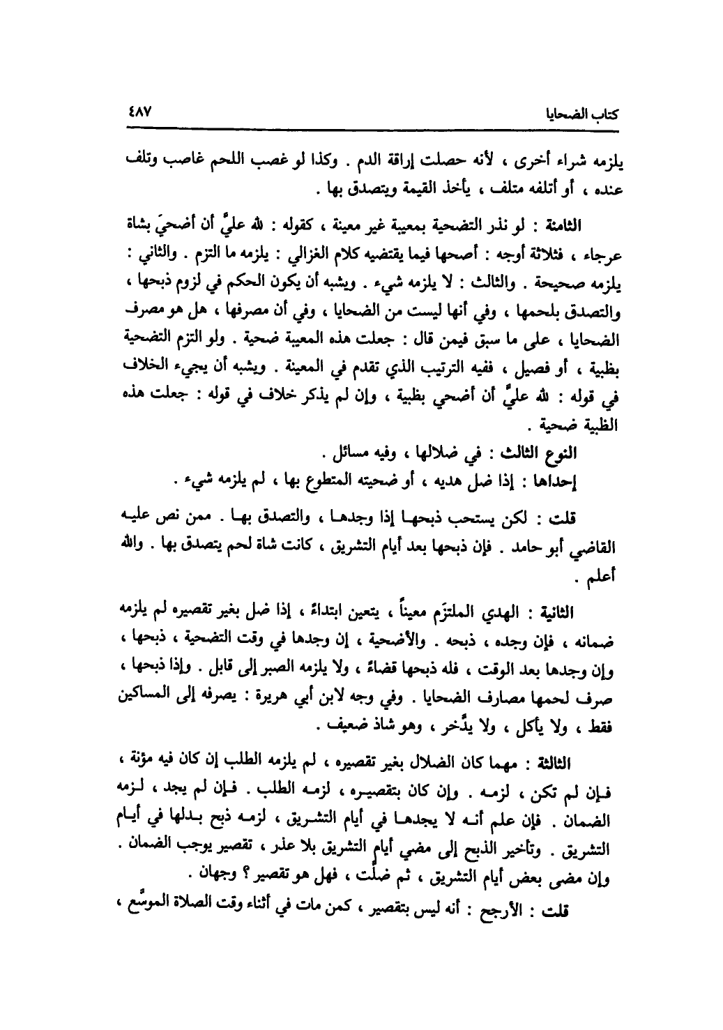 يلزمه شراء أخرى، لانه حصلت إراقة الدم. وكذا لو غصب اللحم غاصب وتلف عنده، أو أتلفه متلف، يأخذ القيمة ويتصدق بها. الثامنة: لو نذر التضحية بمعيبة غير معينة، كقوله: لله علي أن أضحي بشاة عرجاء، فثلاثة أوجه: أصحها فيما يقتضيه كلام الغزالي: يلزمه ما التزم. والثاني: يلزمه صحيحة. والثالث: لا يلزمه شئ. ويشبه أن يكون الحكم في لزوم ذبحها، والتصدق بلحمها، وفي أنها ليست من الضحايا وفي أن مصرفها، هل هو مصرف الضحايا، على ما سبق فيمن قال: جعلت هذه المعيبة ضحية. ولو التزم التضحية بظبية، أو فصيل، ففيه الترتيب الذي تقدم في المعينة. ويشبه أن يجئ الخلاف في قوله: لله على أن أضحي بظبية، وإن لم يذكر خلاف في قوله: جعلت هذه الظبية ضحية. النوع الثالث: في ضلالها، وفيه مسائل. إحداها: إذا ضل هديه، أو ضحيته المتطوع بها، لم يلزمه شئ. قلت: لكن يستحب ذبحها إذا وجدها، والتصدق بها. ممن نص عليه القاضي أبو حامد. فإن ذبحها بعد أيام التشريق، كانت شاة لحم يتصدق بها. والله أعلم. الثانية: الهدي الملتزم معينا، يتعين ابتداءا، إذا ضل بغير تقصيره، لم يلزمه ضمانه، فإن وجده، ذبحه. والاضحية، إن وجدها في وقت التضحية، ذبحها، وإن وجدها بعد الوقت، فله ذبحها قضاء، ولا يلزمه الصبر إلى قابل. وإذا ذبحها، صرف لحمها مصارف الضحايا. وفي وجه لابن أبي هريرة: يصرفه إلى المساكين فقط، ولا يأكل، ولا يدخر، وهو شاذ ضعيف. الثالثة: مهما كان الضلال بغير تقصيره، لم يلزمه الطلب إن كان فيه مؤنة، فإن لم تكن، لزمه. وإن كان بتقصيره، لزمه الطلب. فإن لم يجد، لزمه الضمان. فإن علم أنه لا يجدها في أيام التشريق، لزمه ذبح بدلها في أيام التشريق. وتأخير الذبح إلى مضي أيام التشريق بلا عذر، تقصير يوجب الضمان. وإن مضى بعض أيام التشريق، ثم ضلت، فهل هو تقصير ؟ وجهان. قلت: الارجح: أنه ليس بتقصير، كمن مات في أثناء وقت الصلاة الموسع،