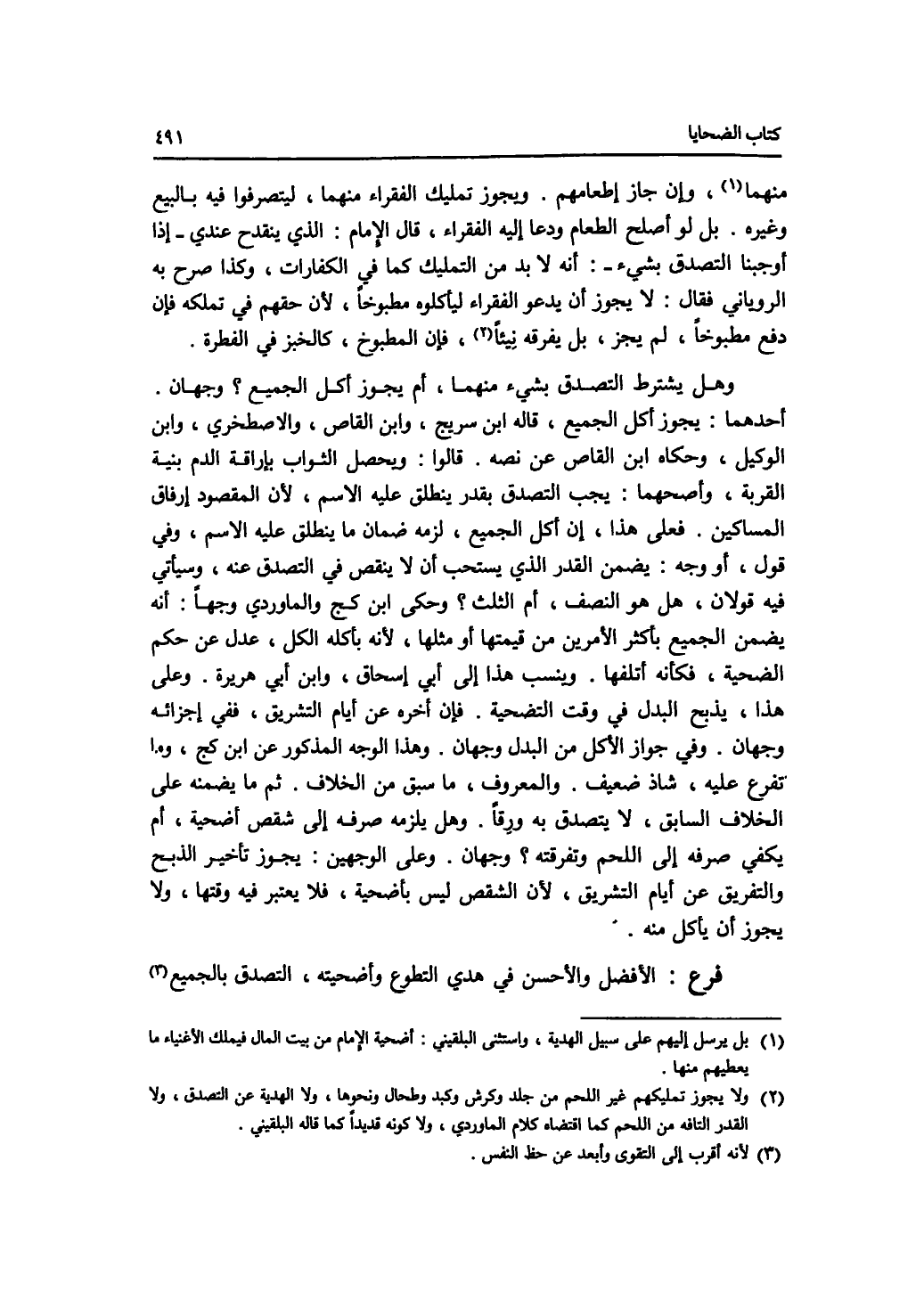 منهما، وإن جاز إطعامهم. ويجوز تمليك الفقراء منهما، ليتصرفوا فيه بالبيع وغيره. بل لو أصلح الطعام ودعا إليه الفقراء، قال الامام: الذي ينقدح عندي - إذا أوجبنا التصدق بشئ -: أنه لا بد من التمليك كما في الكفارات، وكذا صرح به الروياني فقال: لا يجوز أن يدعو الفقراء ليأكلوه مطبوخا، لان حقهم في تملكه فإن دفع مطبوخا، لم يجز، بل يفرقه نيئا، فإن المطبوخ، كالخبز في الفطرة. وهل يشترط التصدق بشئ منهما، أم يجوز أكل الجميع ؟ وجهان. أحدهما: يجوز أكل الجميع، قاله ابن سريج، وابن القاص، والاصطخري، وابن الوكيل، وحكاه ابن القاص عن نصه. قالوا: ويحصل الثواب بإراقة الدم بنية القربة، وأصحهما: يجب التصدق بقدر ينطلق عليه الاسم، لان المقصود إرفاق المساكين. فعلى هذا، إن أكل الجميع، لزمه ضمان ما ينطلق عليه الاسم، وفي قول، أو وجه: يضمن القدر الذي يستحب أن لا ينقص في التصدق عنه، وسيأتي فيه قولان، هل هو النصف، أم الثلث ؟ وحكى ابن كج والماوردي وجها: أنه يضمن الجميع بأكثر الامرين من قيمتها أو مثلها، لانه بأكله الكل، عدل عن حكم الضحية، فكأنه أتلفها. وينسب هذا إلى أبي إسحق، وابن أبي هريرة. وعلى هذا، يذبح البدل في وقت التضحية. فإن أخره أيام التشريق، ففي إجزائه وجهان. وفي جواز الاكل من البدل وجهان. وهذا الوجه المذكور عن ابن كج، وما تفرع عليه، شاذ ضعيف. والمعروف، ما سبق من الخلاف. ثم ما يضمنه على الخلاف السابق، لا يتصدق به ورقا. وهل يلزمه صرفه إلى شقص أضحية، أم يكفي صرفه إلى اللحم وتفرقته ؟ وجهان. وعلى الوجهين: يجوز تأخير الذبح والتفريق عن أيام التشريق، لان الشقص ليس بأضحية، فلا يعتبر فيه وقتها، ولا يجوز أن يأكل منه. فرع الافضل والاحسن في هدي التطوع وأضحيته، التصدق بالجميع