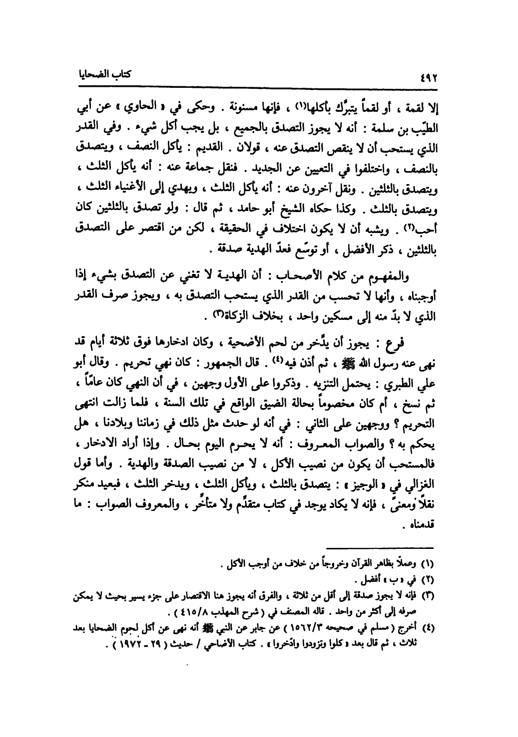 إلا لقمة، أو لقما يتبرك بأكلها، فإنها مسنونة. وحكى في الحاوي عن أبي الطيب بن سلمة: أنه لا يجوز التصدق بالجميع، بل يجب أكل شئ. وفي القدر الذي يستحب أن لا نقص التصدق عنه، قولان. القديم: يأكل النصف، ويتصدق بالنصف، واختلفوا في التعيين عن الجديد. فنقل جماعة عنه: أنه يأكل الثلث، ويتصدق بالثلثين. ونقل آخرون عنه: أنه يأكل الثلث، ويهدي إلى الاغنياء الثلث، ويتصدق بالثلث. وكذا حكاه الشيخ أبو حامد، ثم قال: ولو تصدق بالثلثين كان أحب. ويشبه أن لا يكون اختلاف في الحقيقة، لكن من اقتصر على التصدق بالثلثين، ذكر الافضل، أو توسع فعد الهدية صدقة. والمفهوم من كلام الاصحاب: أن الهدية لا تغني عن التصدق بشئ إذا أوجبناه، وأنها لا تحسب من القدر الذي يستحب التصدق به، ويجوز صرف القدر الذي لا بد منه إلى مسكين واحد، بخلاف الزكاة. فرع يجوز أن يدخر من لحم الاضحية، وكان ادخارها فوق ثلاثة أيام قد نهى عنه رسول الله - صلى الله عليه وسلم -، ثم أذن فيه. قال الجمهور: كان نهي تحريم. وقال أبو علي الطبري: يحتمل التنزيه. وذكروا على الاول وجهين، في أن النهي كان عاما، ثم نسخ، أم كان مخصوصا بحالة الضيق الواقع في تلك السنة، فلما زالت، انتهى التحريم ؟ ووجهين على الثاني: في أنه لو حدث مثل ذلك في زماننا وبلادنا، هل يحكم به ؟ والصواب المعروف: أنه لا يحرم اليوم بحال. وإذا أراد الادخار، فالمستحب أن يكون من نصيب الاكل، لا من نصيب الصدقة والهدية. وأما قول الغزالي في الوجيز: يتصدق بالثلث، ويأكل الثلث، ويدخر الثلث، فبعيد منكر نقلا ومعنى، فإنه لا يكاد يوجد في كتاب متقدم ولا متأخر، والمعروف الصواب: ما قدمناه.