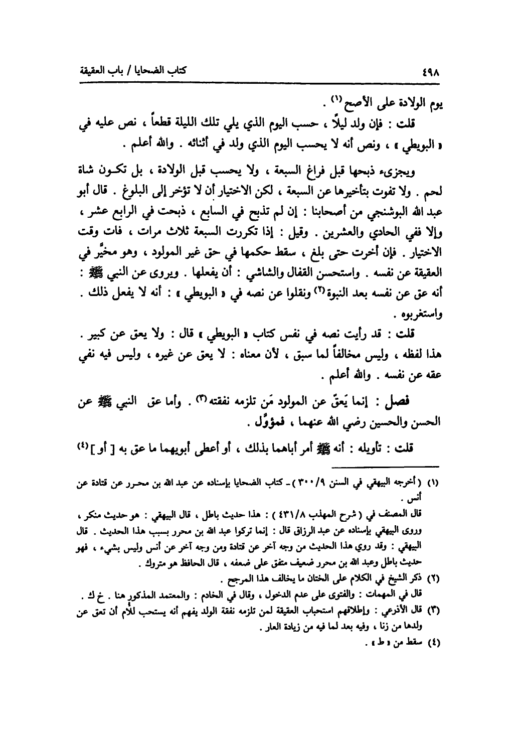 يوم الولادة على الاصح. قلت: وإن ولد ليلا، حسب اليوم الذي يلي تلك الليلة قطعا، نص عليه في البويطي، ونص أنه لا يحسب اليوم الذي ولد في أثنائه. والله أعلم. ويجزئ ذبحها قبل فراغ السبعة، ولا يحسب قبق الولادة، بل تكون شاة لحم. ولا تفوت بتأخيرها عن السبعة، لكن الاختيار أن لا تؤخر إلى البلوغ. قال أبو عبد الله البوشنجي من أصحابنا: إن لم تذبح في السابع، ذبحت في الرابع عشر، وإلا ففي الحادي والعشرين. وقيل: إذا تكررت السبعة ثلاث مرات، فات وقت الاختيار. فإن أخرت حتى بلغ، سقط حكمها في حق غير المولود، وهو مخير في العقيقة عن نفسه. واستحسن القفال والشاشي: أن يفعلها. ويروى عن النبي - صلى الله عليه وسلم -: أنه عق عن نفسه بعد النبوة. ونقلوا عن نصه في البويطي: أنه لا يفعل ذلك، واستغربوه. قلت: قد رأيت نصه في نفس كتاب البويطي قال: ولا يعق عن كبير. هذا لفظه، وليس مخالفا لما سبق، لان معناه: لا يعق عن غيره، وليس فيه نفي عقه عن نفسه. والله أعلم. فصل إنما يعق عن المولود من تلزمه نفقته. وأما عق النبي - صلى الله عليه وسلم - عن الحسن والحسين رضي الله عنهما، فمؤول. قلت: تأويله: أنه - صلى الله عليه وسلم - أمر أباهما بذلك، أو أعطى أبويهما ما عق به أو