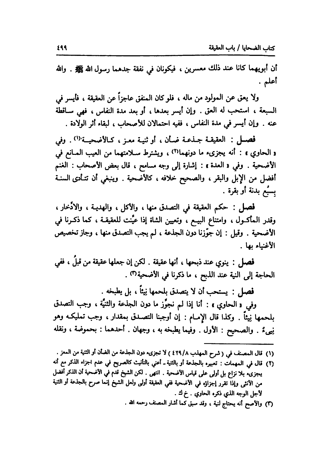 : أن أبويهما كانا عند ذلك معسرين، فيكونان في نفقة جدهما رسول الله - صلى الله عليه وسلم -. والله أعلم. ولا يعق عن المولود من ماله، فلو كان المنفق عاجزا عن القيقة، فإيسر في السبعة،. استحب له العق. وإن أيسر بعدها، أو بعد مدة النفاس، فهي ساقطة عنه وإن أيسر في مدة النفاس، ففيه احتمالان للاصحاب، لبقاء أثر الولادة. فصل العقيقة جذعة ضأن، أو ثنية معز، كالاضحية. وفي الحاوي: أنه يجزئ ما دونهما، ويشترط سلامتهما من العيب المانع في الاضحية. وفي العدة: إشارة إلى وجه مسامح، قال بعض الاصحاب: الغنم أفضل من الابل والبقر، والصحيح خلافه، كالاضحية. وينبغي أن تتأدى السنة بسبع بدنة أو بقرة. فصل حكم العقيقة في التصدق منها، والاكل، والهدية، والادخار، وقدر المأكول، وامتناع البيع، وتعيين الشاة إذا عينت للعقيقة، كما ذكرنا في الاضحية. وقيل: إن جوزنا دون الجذعة، لم يجب التصدق منها، وجاز تخصيص الاغنياء بها. فصل ينوي عند ذبحها، أنها عقيقة. لكن إن جعلها عقيقة من قبل، ففي الحاجة إلى النية عند الذبح، ما ذكرنا في الاضحية. فصل يستحب أن لا يتصدق بلحمها نيئا، بل يطبخه. وفي الحاوي: أنا إذا لم نجوز ما دون الجذعة والثنية، وجب التصدق بلحمها نيئا. وكذا قال الامام: إن أوجبنا التصدق بمقدار، وجب تمليكه وهو نيئ. والصحيح: الاول. وفيما يطبخه به، وجهان. أحدهما: بحموضة، ونقله