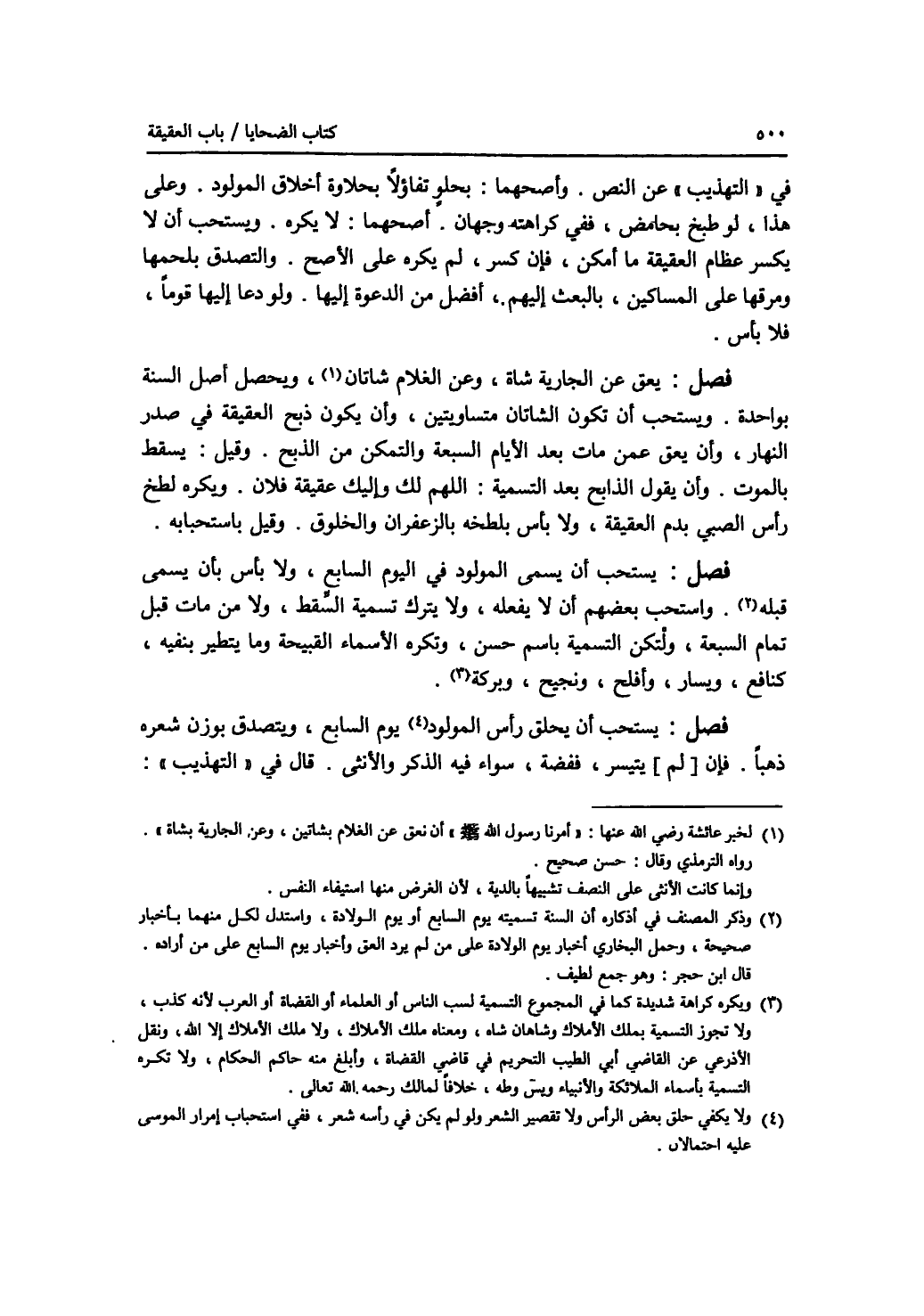 في التهذيب عن النص. وأصحهما: بحلو تفاؤلا بحلاوة أخلاق المولود. وعلى هذا، لو طبخ بحامض، ففي كراهته وجهان. أصحهما: لا يكره. ويستحب أن لا يكسر عظام العقيقة ما أمكن، فإن كسر، لم يكره على الاصح. والتصدق بلحمها ومرقها على المساكين، بالبعث إليهم، أفضل من الدعوة إليها. ولو دعا إليها قوما، فلا بأس. فصل يعق عن الجارية شاة، وعن الغلام شاتان، ويحصل أصل السنة بواحدة. ويستحب أن تكون الشاتان متساويتين، وأن يكون ذبح العقيقة في صدر النهار، وأن يعق عمن مات بعد الايام السبعة والتمكن من الذبح. وقيل: يسقط بالموت. وأن يقول الذابح بعد التسمية: اللهم لك وإليك عقيقة فلان. ويكره لطخ رأس الصبي بدم العقيقة، ولا بأس بلطخه بالزعفران والخلوق. وقيل باستحبابه. فصل ستحب أن يسمى المولود في اليوم السابع، ولا بأس بأن يسمى قبله. واستحب بعضهم أن لا يفعله، ولا يترك تسمية السقط، ولا من مات قبل تمام السبعة، ولتكن التسمية باسم حسن، وتكره الاسماء القبيحة وما يتطير بنفيه، كنافع، ويسار، وأفلح، ونجيح، وبركة. فصل يستحب أن يحلق رأس المولود يوم السابع، ويتصدق بوزن شعره ذهبا. فإن لم يتيسر، ففضة، سواء فيه الذكر والانثى. قال في التهذيب: