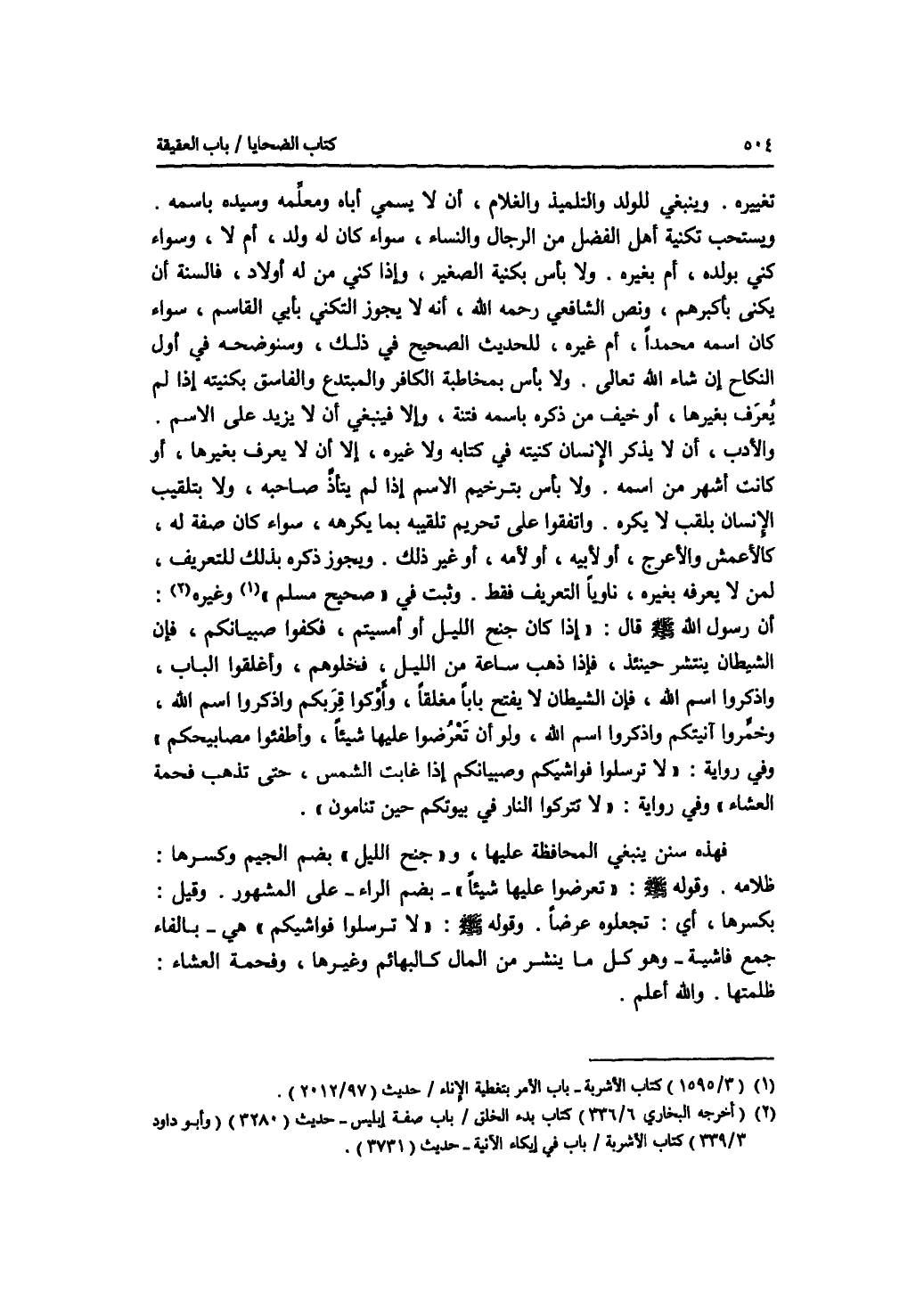 تغييره. وينبغي للولد والتلميذ والغلام، أن لا يسمي أباه ومعلمه وسيده باسمه. ويستحب تكنية أهل الفضل من الرجال والنساء، سواء كان له ولد، أم لا، وسواء كني بولده، أم بغيره. ولا بأس بكنية الصغيرة، وإذا كني من له أولاد، فالسنة أن يكنى بأكبرهم، ونص الشافعي رحمه الله، أنه لا يجوز التكني بأبي القاسم، سواء كان اسمه محمدا، أم غيره، للحديث الصحيح في ذلك، وسنوضحه في أول النكاح إن شاء الله تعالى. ولا بأس بمخاطبة الكافر والمبتدع والفاسق بكنيته إذا لم يعرف بغيرها، أو خيف من ذكره باسمه فتنة، وإلا فينبغي أن لا يزيد على الاسم. وا لادب، أن لا يذكر الانسان كنيته في كتابه ولا غيره، إلا أن لا يعرف بغيرها أو كانت أشهر من اسمه. ولا بأس بترخيم الاسم إذا لم يتأذ صاحبه، ولا بتلقيب الانسان بلقب لا يكره. واتفقوا على تحريم تلقيبه بما يكرهه، سواء كان صفة له، كالاعمش والاعرج، أو لابيه، أو لامه، أو غير ذلك. ويجوز ذكره بذلك للتعريف، لمن لا يعرفه بغيره، ناويا التعريف فقط. وثبت في صحيح مسلم وغيره: أن رسول الله - صلى الله عليه وسلم - قال: إذا كان جنح الليل أو أمسيتم، فكفوا صبيانكم، فإن الشيطان ينتشر حينئذ، فإذا ذهب ساعة من الليل، فخلوهم، وأغلقوا الباب، واذكروا اسم الله، فإن الشيطان لا يفتح بابا مغلقا، وأوكوا قربكم واذكروا اسم الله، وخمروا آنيتكم واذكروا اسم الله، ولو أن تعرضوا عليها شيئا، وأطفئوا مصابيحكم وفي رواية: لا ترسلوا فواشيكم وصبيانكم إذا غابت الشمس، حتى تذهب فحمة العشاء وفي رواية: لا تتركوا النار في بيوتكم حين تنامون. فهذه سنن ينبغي المحافظة عليها، وجنح الليل بضم الجيم وكسرها: ظلامه. وقوله - صلى الله عليه وسلم -: تعرضوا عليها شيئا - بضم الراء - على المشهور. وقيل: بكسرها، أي: تجعلوه عرضا. وقوله - صلى الله عليه وسلم -: لا ترسلوا فواشيكم هي - بالفاء جمع فاشية - وهو كل ما ينشر من المال كالبهائم وغيرها، وفحمة العشاء: ظلمتها. والله أعلم.