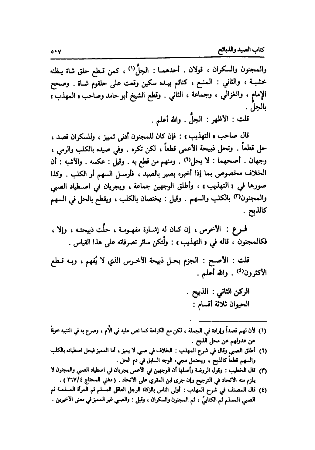 والمجنون والسكران، قولان. أحدهما: الحل، كمن قطع حلق شاة يظنه خشبة. والثاني: المنع، كنائم بيده سكين وقعت على حلقوم شاة. وصحح الامام، والغزالي، وجماعة، الثاني. وقطع الشيخ أبو حامد وصاحب المهذب بالحل. قلت: الاظهر: الحل. والله أعلم. قال صاحب التهذيب: فإن كان للمجنون أدنى تمييز، وللسكران قصد، حل قطعا. وتحل ذبيحة الاعمى قطعا لكن تكره. وفي صيده بالكلب والرمي، وجهان. أصحهما: لا يحل. ومنهم من قطع به. وقيل: عكسه. والاشبه: أن الخلاف مخصص بما إذا أخبره بصير الصيد، فأرسل السهم أو الكلب. وكذا صورها في التهذيب، وأطلق الوجهين جماعة، ويجريان في اصطياد الصبي والمجنون بالكلب والسهم. وقيل: يختصان بالكلب، وقطع بالحل في السهم كالذبح. فرع الاخرس، إن كان له إشارة مفهومة، حلت ذبيحته، وإلا، فكالمجنون، قاله في التهذيب: ولتكن سائر تصرفاته على هذا القياس. قلت: الاصح: الجزم بحل ذبيحة الاخرس الذي لا يفهم، وبه قطع الاكثرون. والله أعلم.