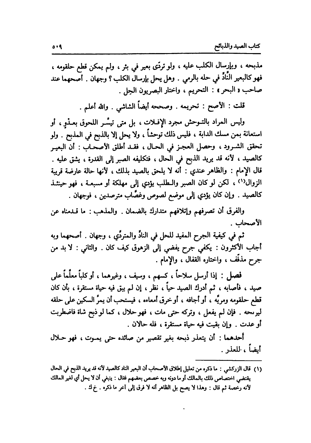 مذبحه، وبإرسال الكلب عليه. ولو تردى بعير في بئر، ولم يمكن قطع حلقومه، فهو كالبعير الناد في حله بالرمي. وهل يحل بإرسال الكلب ؟ وجهان. أصحهما عند صاحب البحر: التحريم، واختار البصريون الحل. قلت: الاصح: تحريمه. وصححه أيضا الشاشي. والله أعلم. وليس المراد بالتوحش مجرد الافلات، بل متى تيسر اللحوق بعدو، أو استعانة بمن مسك الدابة، فليس ذلك توحشا، ولا يحل إلا بالذبح في المذبح. ولو تحقق الشرود، وحصل العجز في الحال، فقد أطلق الاصحاب: أن البعير كالصيد، لانه قد يريد الذبح في الحال، فتكليفه الصبر إلى القدر، يشق عليه. قال الامام: والظاهر عندي: أنه لا يلحق بالصيد بذلك، لانها حالة عارضة قريبة الزوال، لكن لو كان الصبر والطلب يؤدي إلى مهلكة أو مسبعة، فهو حينئذ كالصيد. وإن كان يؤدي إلى موضع لصوص وغصاب مترصدين، فوجهان. والفرق أن تصرفهم وإتلافهم متدارك بالضمان. والمذهب: ما قدمناه عن الاصحاب. ثم في كيفية الجرح المفيد للحل في الناد والمتردي، وجهان. أصحهما وبه أجاب الاكثرون: يكفي جرح يفضي إلى الزهوق كيف كان. والثاني: لا بد من جرح مذفف، واختاره القفال، والامام. فصل إذا أرسل سلاحا، كسهم، وسيف، وغيرهما، أو كلبا معلما على صيد، فأصابه، ثم أدرك الصيد حيا، نظر، إن لم يبق فيه حياة مستقرة، بأن كان قطع حلقومه ومريه، أو أجافه، أو خرق أمعاءه، فيستحب أن يمر السكين على حلقه ليريحه. فإن لم يفعل، وتركه حتى مات، فهو حلال، كما لو ذبح شاة فاضطربت أو عدت. وإن بقيت فيه حياة مستقرة، فله حالان. أحدهما: أن يتعذر ذبحه بغير تقصير من صائده حتى يموت، فهو حلال أيضا، للعذر.
