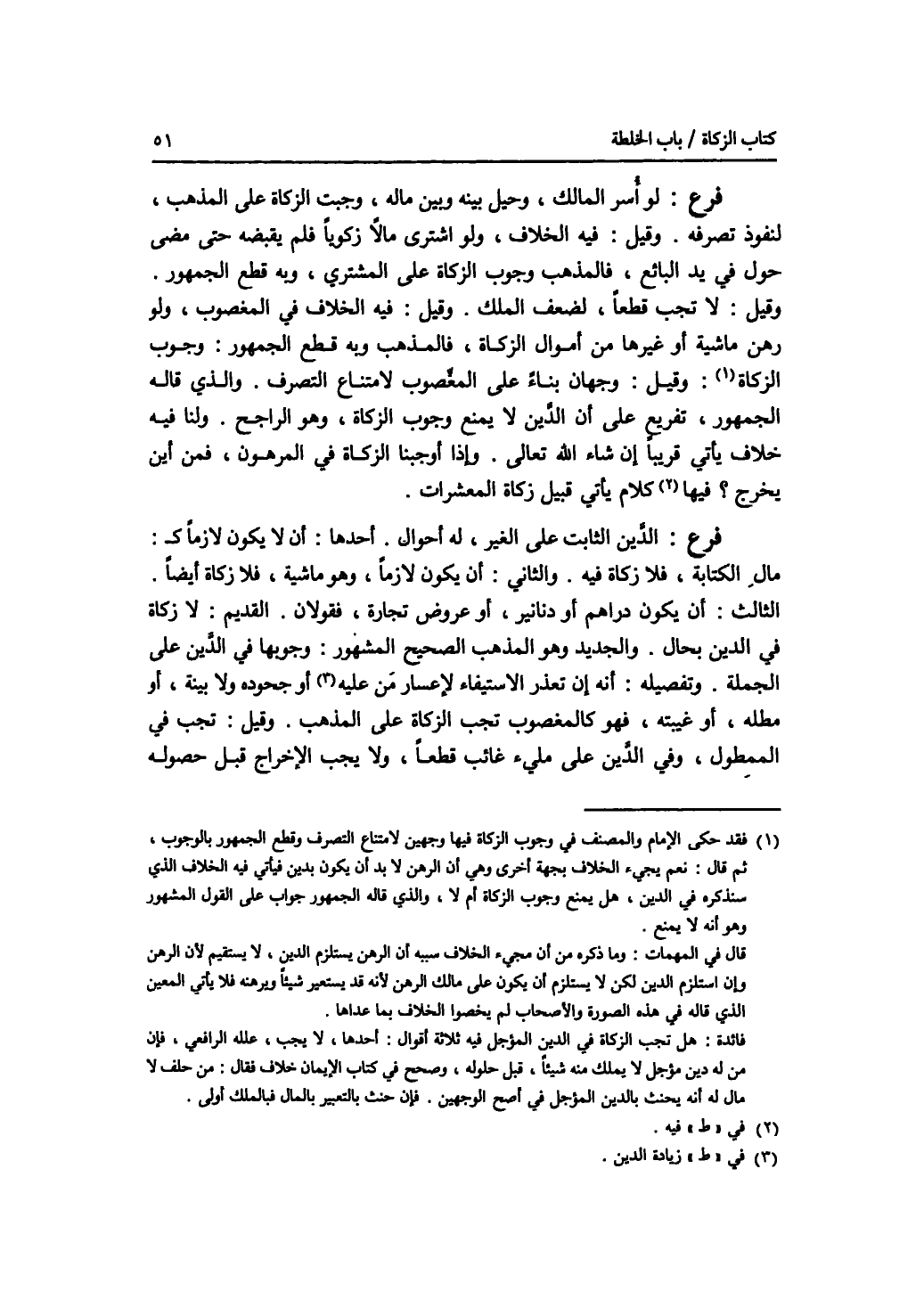 فرع لو دفن ماله بموضع ثم نسيه، ثم تذكر، فهذا ضال، ففيه الخلاف سواء دفن في داره أو في غيرها، وقيل: تجب الزكاة هنا قطعا لتقصيره. فرع لو أسر المالك، وحيل بينه وبين ماله، وجبت الزكاة على المذهب، لنفوذ تصرفه. وقيل: فيه الخلاف، ولو اشترى مالا زكويا فلم يقبضه حتى مضى حول في يد البائع، فالمذهب وجوب الزكاة على المشتري، وبه قطع الجمهور. وقيل: لا تجب قطعا، لضعف الملك. وقيل: فيه الخلاف في المغصوب، ولو رهن ماشية أو غيرها من أموال الزكاة، فالمذهب وبه قطع الجمهور: وجوب الزكاة. وقيل: وجهان بناء على المغصوب لامتناع التصرف. والذي قاله الجمهور، تفريع على أن الدين لا يمنع وجوب الزكاة، وهو الراجح. ولنا فيه خلاف يأتي قريبا إن شاء الله تعالى. وإذا أوجبنا الزكاة في المرهون، فمن أين يخرج ؟ فيه كلام يأتي قبيل زكاة المعشرات. فرع الدين الثابت على الغير، له أحوال. أحدها: أن لا يكون لازما ك: مال الكتابة، فلا زكاة فيه. والثاني: أن يكون لازما، وهو ماشية، فلا زكاة أيضا. الثالث: أن يكون دراهم أو دنانير، أو عروض تجارة، فقولان. القديم: لا زكاة في الدين بحال. والجديد وهو المذهب الصحيح المشهور: وجوبها في الدين على الجملة. وتفصيله: أنه إن تعذر الاستيفاء لاعسار من عليه الدين أو جحوده ولا بينة، أو مطله، أو غيبته، فهو كالمغصوب تجب الزكاة على المذهب. وقيل: تجب في الممطول، وفي الدين على ملئ غائب قطعا، ولا يجب الاخراج قبل حصوله