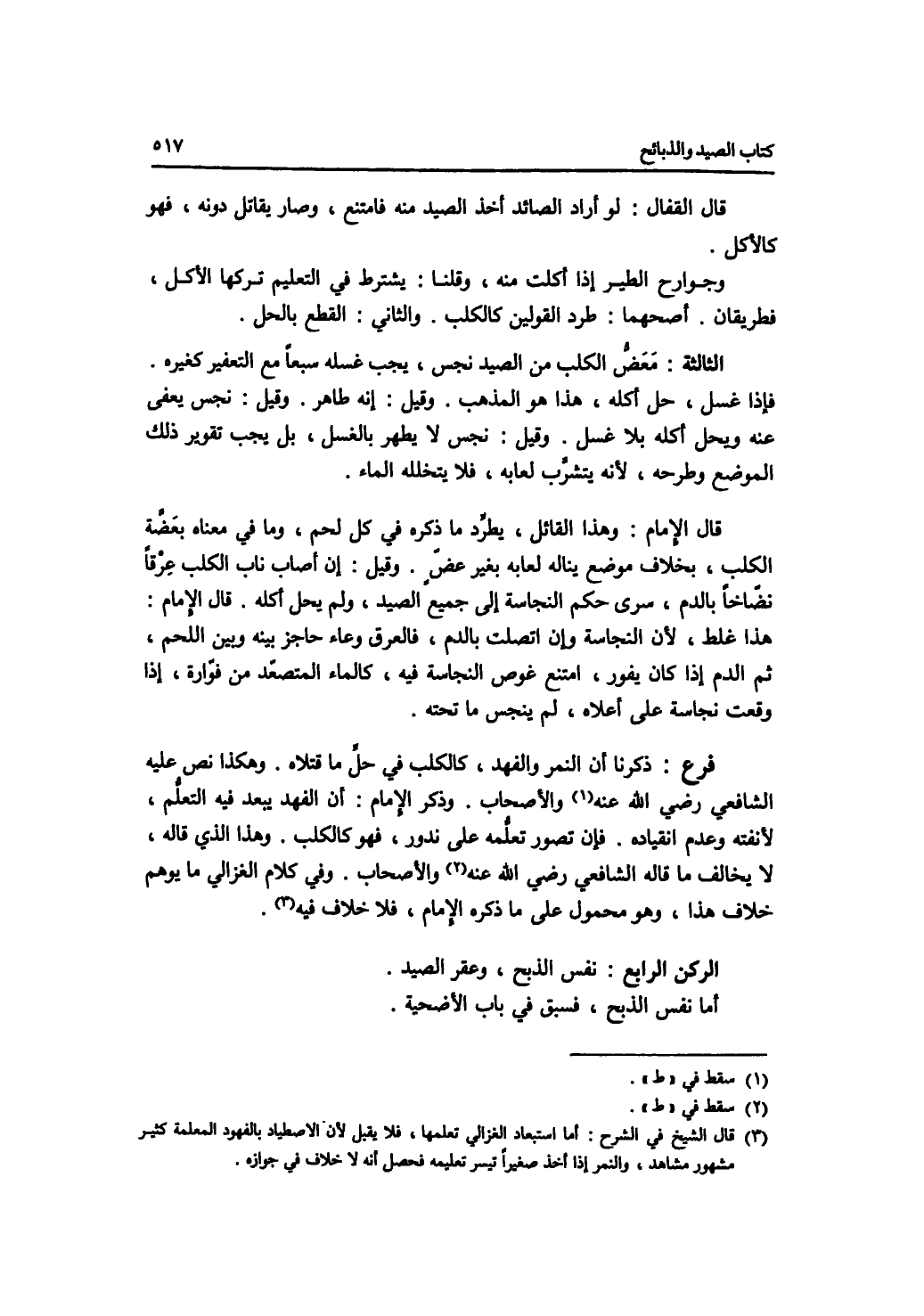 قال القفال: لو أراد الصائد أخذ الصيد منه فامتنع، وصار يقاتل دونه، فهو كالاكل. وجوارح الطير إذا أكلت منه، وقلنا: يشترط في التعليم تركها الاكل، فطريقان. أصحهما: طرد القولين كالكلب. والثاني: القطع بالحل. الثالثة: معض الكلب من الصيد نجس، يجب غسله سبعا مع التعفير كغيره. فإذا غسل، حل أكله، هذا هو المذهب. وقيل: إنه طاهر. وقيل: نجس يعفى عنه ويحل أكله بلا غسل. وقيل: نجس لا يطهر بالغسل، بل يجب تقوير ذلك الموضع وطرحه، لانه يتشرب لعابه، فلا يتخلله الماء. قال الامام: وهذا القائل، يطرد ما ذكره في كل لحم، وما في معناه بعضه الكلب، بخلاف موضع يناله لعابه بغير عض. وقيل: إن أصاب ناب الكلب عرقا نضاخا بالدم، سرى حكم النجاسة إلى جميع الصيد، ولم يحل أكله. قال الامام: هذا غلط، لان النجاسة وإن اتصلت بالدم، فالعرق وعاء حاجز بينه وبين اللحم، ثم الدم إذا كان يفور، امتنع غوص النجاسة فيه كالماء المتصعد من فواره، إذا وقعت نجاسة على أعلاه، لم ينجس ما تحته. فرع ذكرنا أن النمر والفهد، كالكلب في حل ما قتلاه. وهكذا نص عليه الشافعي والاصحاب. وذكر الامام: أن الفهد يبعد فيه التعلم، لانفته وعدم انقياده. فإن تصور تعلمه على ندور، فهو كالكلب. وهذا الذي قاله، لا يخالف ما قاله الشافعي والاصحاب. وفي كلام الغزالي ما يوهم خلاف هذا، وهو محمول على ما ذكره الامام، فلا خلاف فيه.
