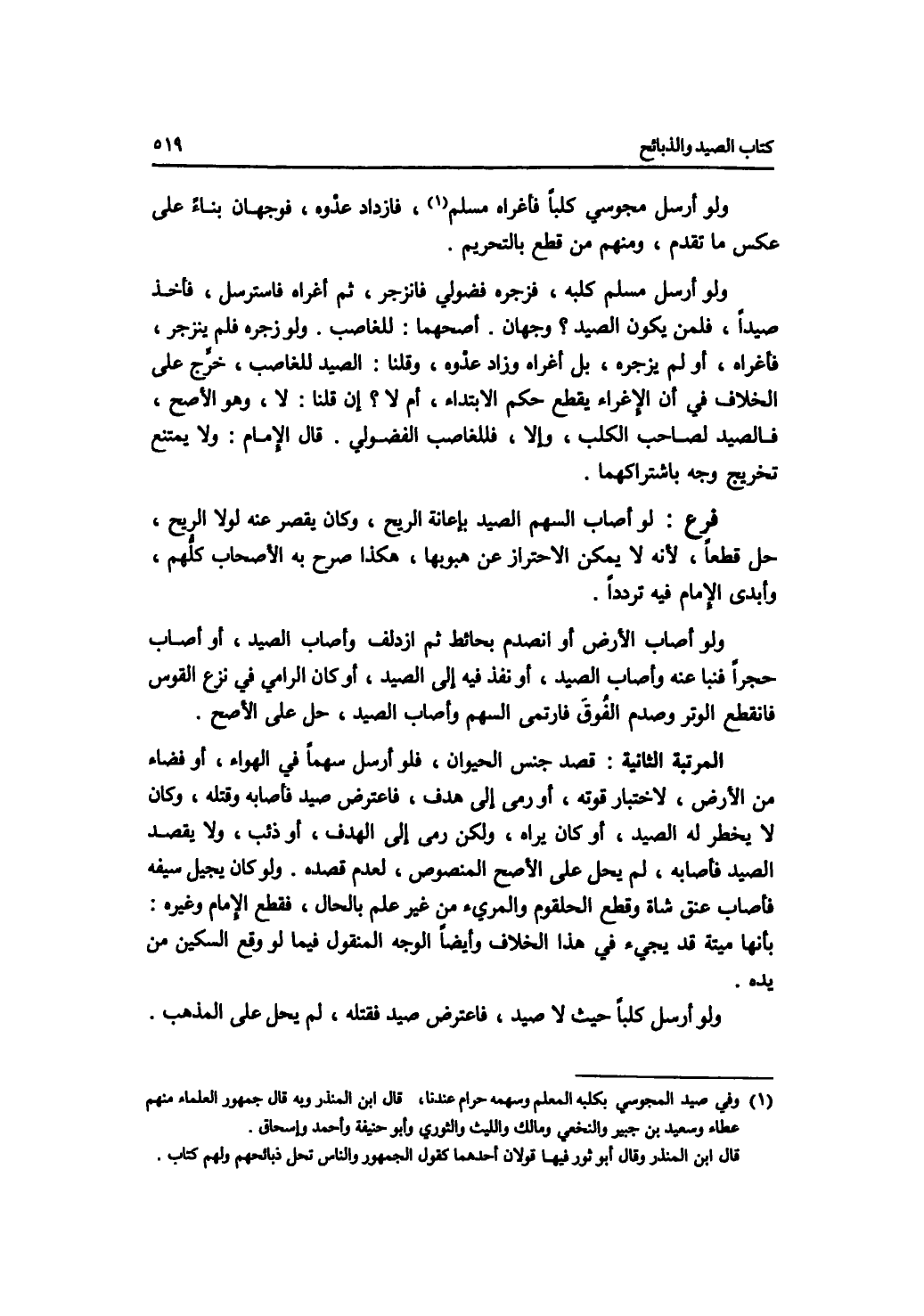 ولو أرسل مجوسي كلبا فأغراه مسلم، فازداد عدوه، فوجهان بناء على عكس ما تقدم، ومنهم من قطع بالتحريم. ولو أرسل مسلم كلبه، فزجره فضولي فانزجر، ثم أغراه فاسترسل، فأخذ صيدا، فلمن يكون الصيد ؟ وجهان. أصحهما: للغاصب. ولو زجره فلم ينزجر، فأغراه، أو لم يزجره، بل أغراه وزاد عدوه، وقلنا: الصيد للغاصب، خرج على الخلاف في أن الاغراء يوسف يقطع حكم الابتداء، أم لا ؟ إن قلنا: لا، وهو الاصح، فالصيد لصاحب الكلب، وإلا، فللغاصب الفضولي. قال الامام: ولا يمتنع تخريج وجه باشتراكهما. فرع لو أصاب السهم الصيد بإعانة الريح، وكان يقصر عنه لولا الريح، حل قطعا، لانه لا يمكن الاحتراز عن هبوبها، هكذا صرح به الاصحاب كلهم، وأبدى الامام فيه ترددا. ولو أصاب الارض أو انصدم بحائط ثم ازدلف وأصاب الصيد، أو أصاب حجرا فنبا عنه وأصاب الصيد أو نفذ فيه إلى الصيد، أو كان الرامي في نزع القوس فانقطع الوتر وصدم الفوق فارتمى السهم وأصاب الصيد، حل على الاصح. المرتبة الثانية: قصد جنس الحيوان، فلو أرسل سهما في الهواء، أو فضاء من الارض، لاختبار قوته، أو رمى إلى هدف، فاعترض صيد فأصابه وقتله، وكان لا يخطر له الصيد، أو كان يراه، ولكن رمى إلى الهدف. أو ذئب، ولا يقصد الصيد فأصابه، لم يحل على الاصح المنصوص، لعدم قصده. ولو كان يجيل سيفه فأصاب عنق شاة وقطع الحلقوم والمرئ من غير علم بالحال، فقطع الامام وغيره: بأنها ميتة قد يجئ في هذا الخلاف وأيضا الوجه المنقول فيما لو وقع السكين من يده. ولو أرسل كلبا حيث لا صيد، فاعترض صيد فقتله، لم يحل على المذهب.