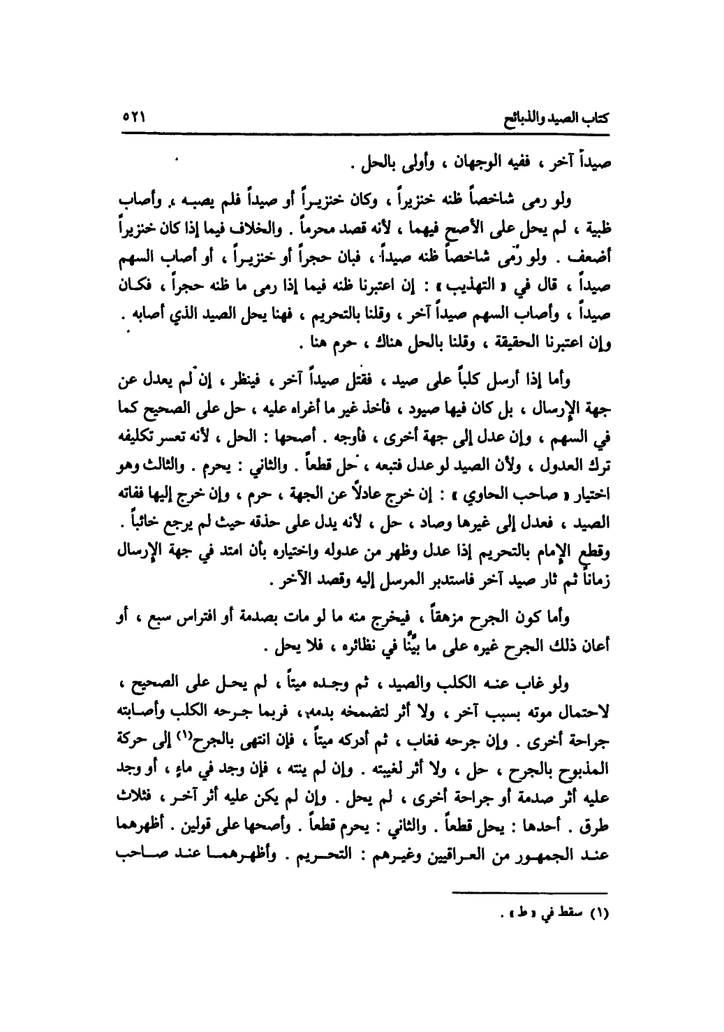 صيدا آخر، ففيه الوجهان، وأولى بالحل. ولو رمى شاخصا ظنه خنزيرا، وكان خنزيرا، أو صيدا فلم يصبه، وأصاب ظبية، لم يحل على الاصح فيهما، لانه قصد محرما. والخلاف فيما إذا كان خنزيرا أضعف. ولو رمى شاخصا ظنه صيدا، فبان حجرا أو خنزيرا، أو أصاب السهم صيدا، قال في التهذيب: إن اعتبرنا ظنه فيما إذا رمى ما ظنه حجرا، فكان صيدا، وأصاب السهم صيدا آخر، وقلنا بالتحريم، فهنا يحل الصيد الذي أصابه. وإن اعتبرنا الحقيقة، وقلنا بالحل هناك، حرم هنا. وأما إذا أرسل كلبا على صيد، فقتل صيدا أخر، فينظر، إن لم يعدل عن جهة الارسال، بل كان فيها صيود، فأخذ غير ما أغراه عليه، حل على الصحيح كما في السهم، وإن عدل إلى جهة أخرى، فأوجه. أصحها: الحل، لانه تعسر تكليفه ترك العدول، ولان الصيد لو عدل فتبعه، حل قطعا. والثاني: يحرم. والثالث وهو اختيار صاحب الحاوي: إن خرج عادلا عن الجهة، حرم، وإن خرج إليها ففاته الصيد، فعدل إلى غيرها وصاد، حل، لانه يدل على حذقه حيث لم يرجع خائبا. وقطع الامام بالتحريم إذا عدل وظهر من عدوله واختياره بأن امتد في جهة الارسال زمانا ثم ثار صيد آخر فاستدبر المرسل إليه وقصد الآخر. وأما كون الجرح مزهقا، فيخرج منه ما لو مات بصدمة أو افتراس سبع، أو أعان ذلك الجرح غيره على ما بينا في نظائره، فلا يحل. ولو غاب عنه الكلب والصيد، ثم وجده ميتا، لم يحل على الصحيح، لاحتمال موته بسبب آخر، ولا أثر لتضمخه بدمه، فربما جرحه الكلب وأصابته جراحة أخرى. وإن جرحه فغاب، ثم أدركه ميتا، فإن انتهى إلى حركة المذبوح بالجرح، حل، ولا أثر لغيبته. وإن لم ينته، فإن وجد في ماء، أو وجد عليه أثر صدمة أو جراحة أخرى، لم يحل. وإن لم يكن عليه أثر آخر، فثلاث طرق. أحدها: يحل قطعا. والثاني: يحرم قطعا. وأصحها على قولين. أظهرهما عند الجمهور من العراقيين وغيرهم: التحريم. وأظهرهما عند صاحب